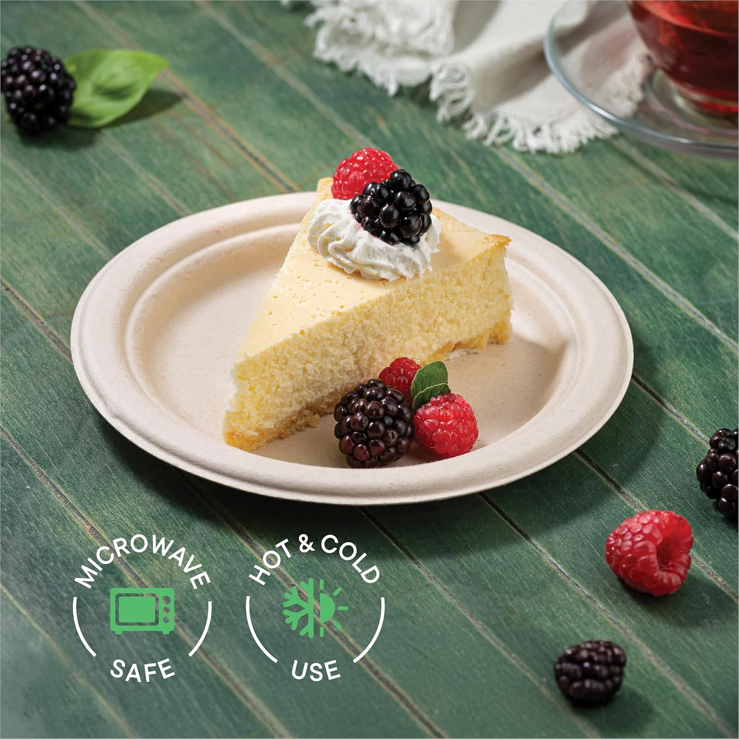 Hot or Cold Use: These Plates can be used for Hot or Cold Food Items. It offers Reliable Strength and Does Not contain any Plastic or Wax Lining. These Plates are Microwavable & Freezable. Oil and Cut-resistant Note: Hot Foods can cause the plates to perspire and condensation to form at the bottom.