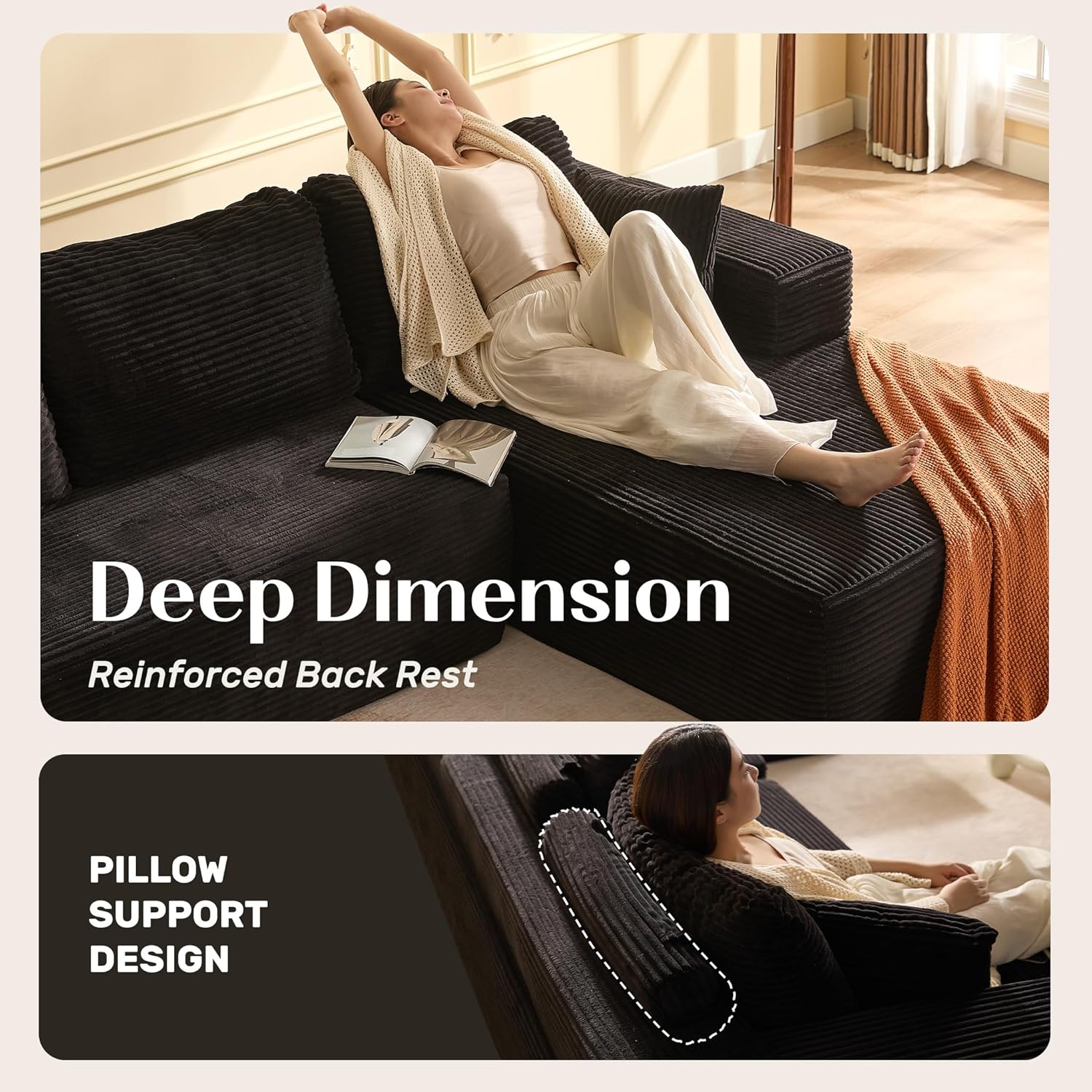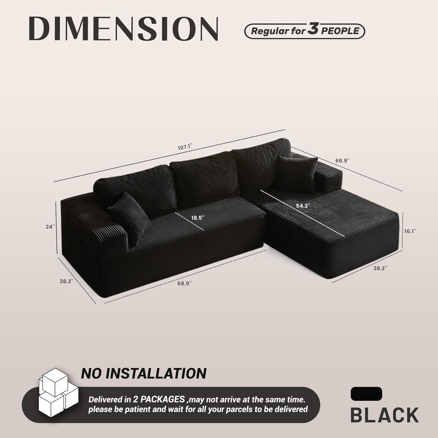 107″ Boneless Couch with Deep Seat, Set of Modular Sectional Sofa, Cloud Sectional Couch for Living Room, No Assembly Required, Corduroy, L-Shape Left, Black