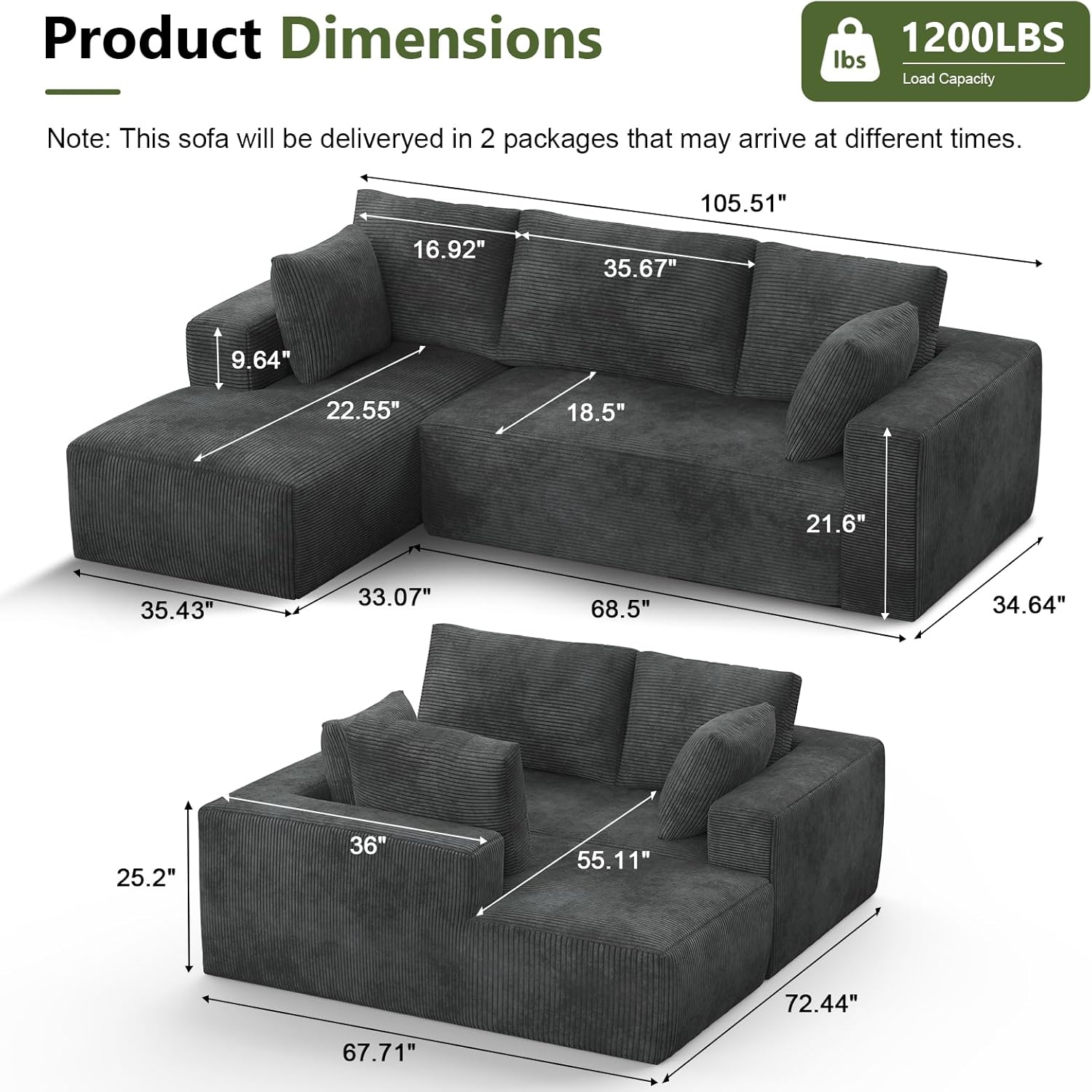 [No Assembly Required] Reimagine your living space with our modular cloud couch – simply unbox both packages, gently tap each section to activate its bounce and watch as your sofa magically takes shape – reaching full fluffiness within 72 hours while delivering instant comfort. Please note: For optimal protection, your sofa modular ships in two separate packages.