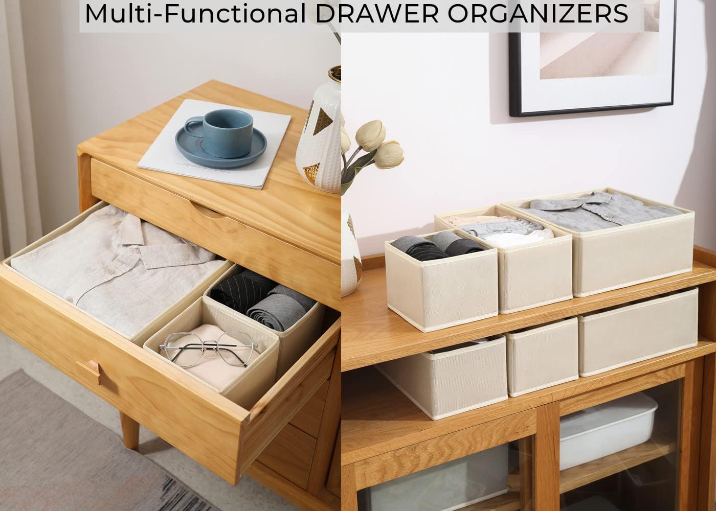 【DRESSER ORGANIZER】Our dresser drawer organizers with modern design & light gray or warm beige, the home organization must need, perfectly fit dresser, bedroom, living room and so on.