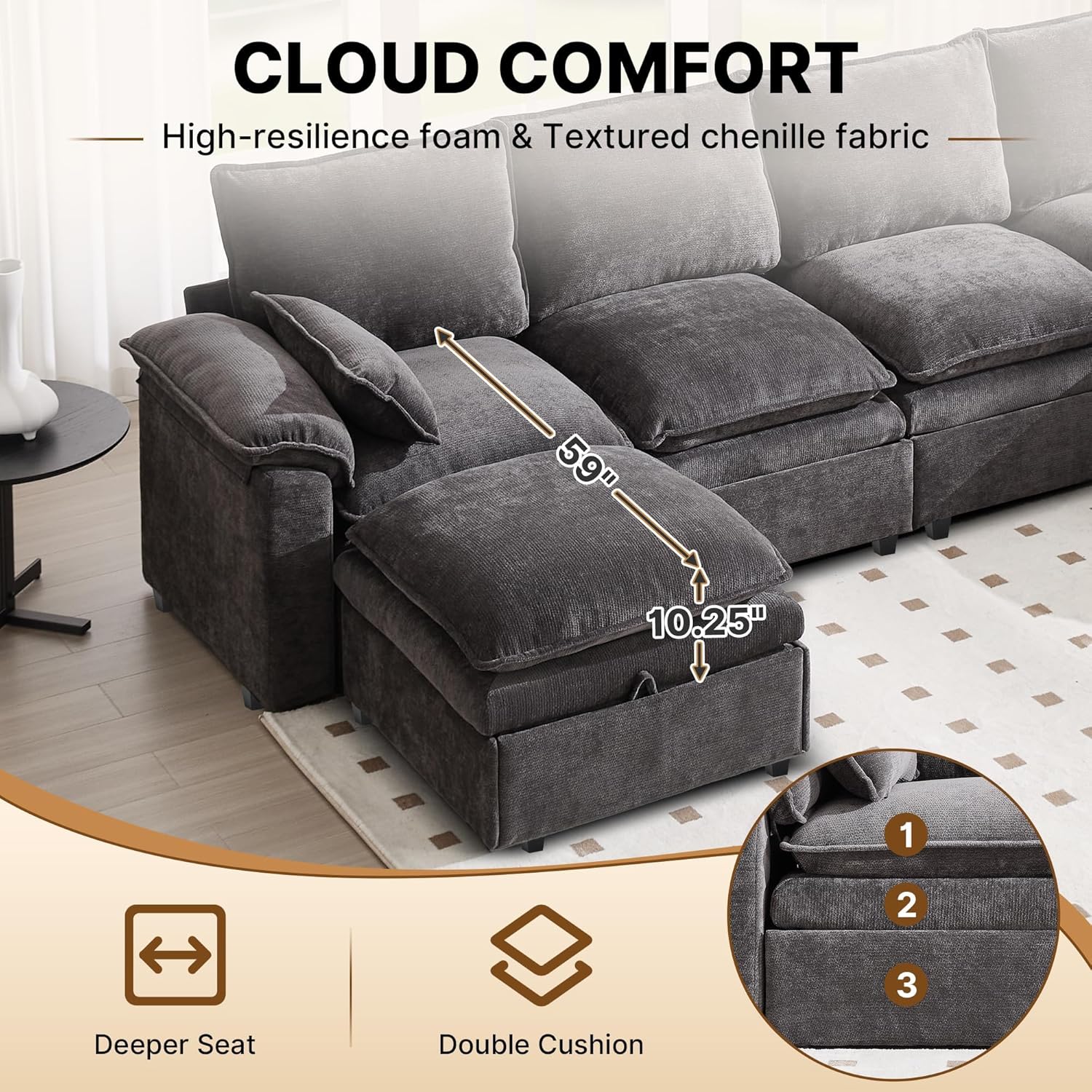 Cloud-Like Comfort: Chenille Deep Seat Couch Designed for the ultimate lounging experience, this oversized sectional features high-resilience sponge cushioning wrapped in premium, soft chenille fabric. The texture is breathable and skin-friendly, offering that viral cloud couch feeling. Note: Please pat the cushions upon unboxing to restore their fluffy shape.