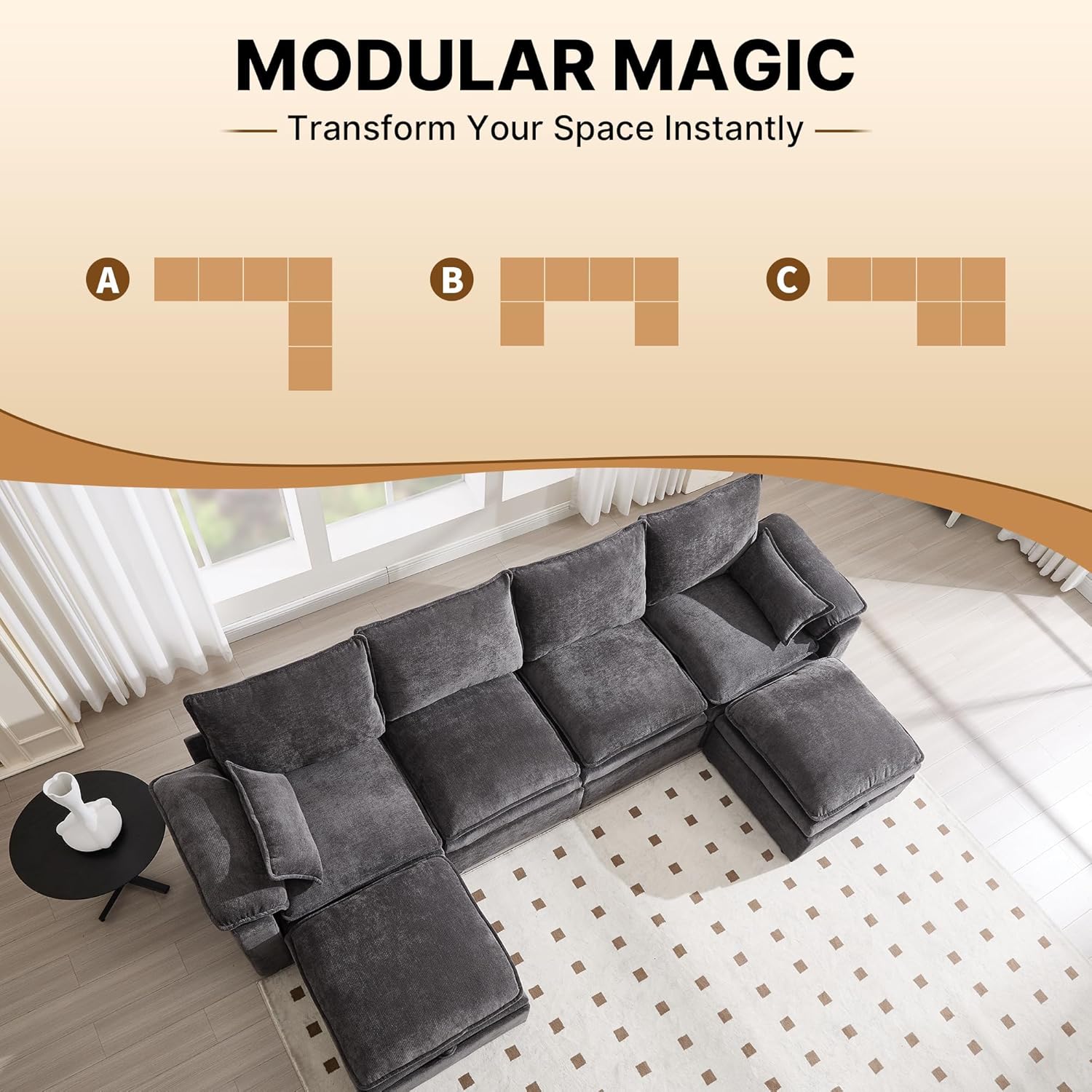 Infinite Layouts: Customizable Modular Design Embrace the freedom of a truly modular sectional sofa where every seat and ottoman is movable. Effortlessly reconfigure your furniture into a U-shaped couch, an L-shaped sectional, or a spacious sleeper-style bed for movie nights. This flexible design adapts perfectly to any living room layout or evolving lifestyle needs.
