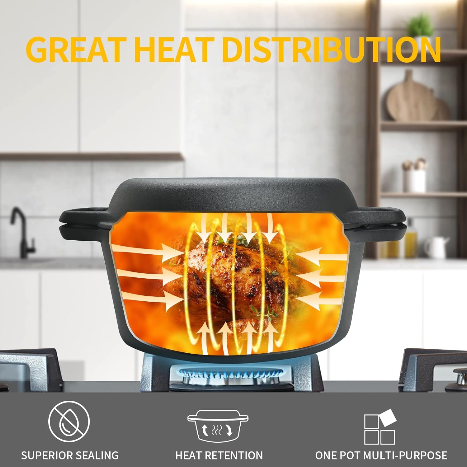 Pre-seasoned 2-in-1 cast iron dutch oven: The 2-In-1 cast iron dutch oven pot with skillet lid has been burned with vegetable oil,(no synthetic coatings or chemicals). The shallow skillet that can be used as a lid