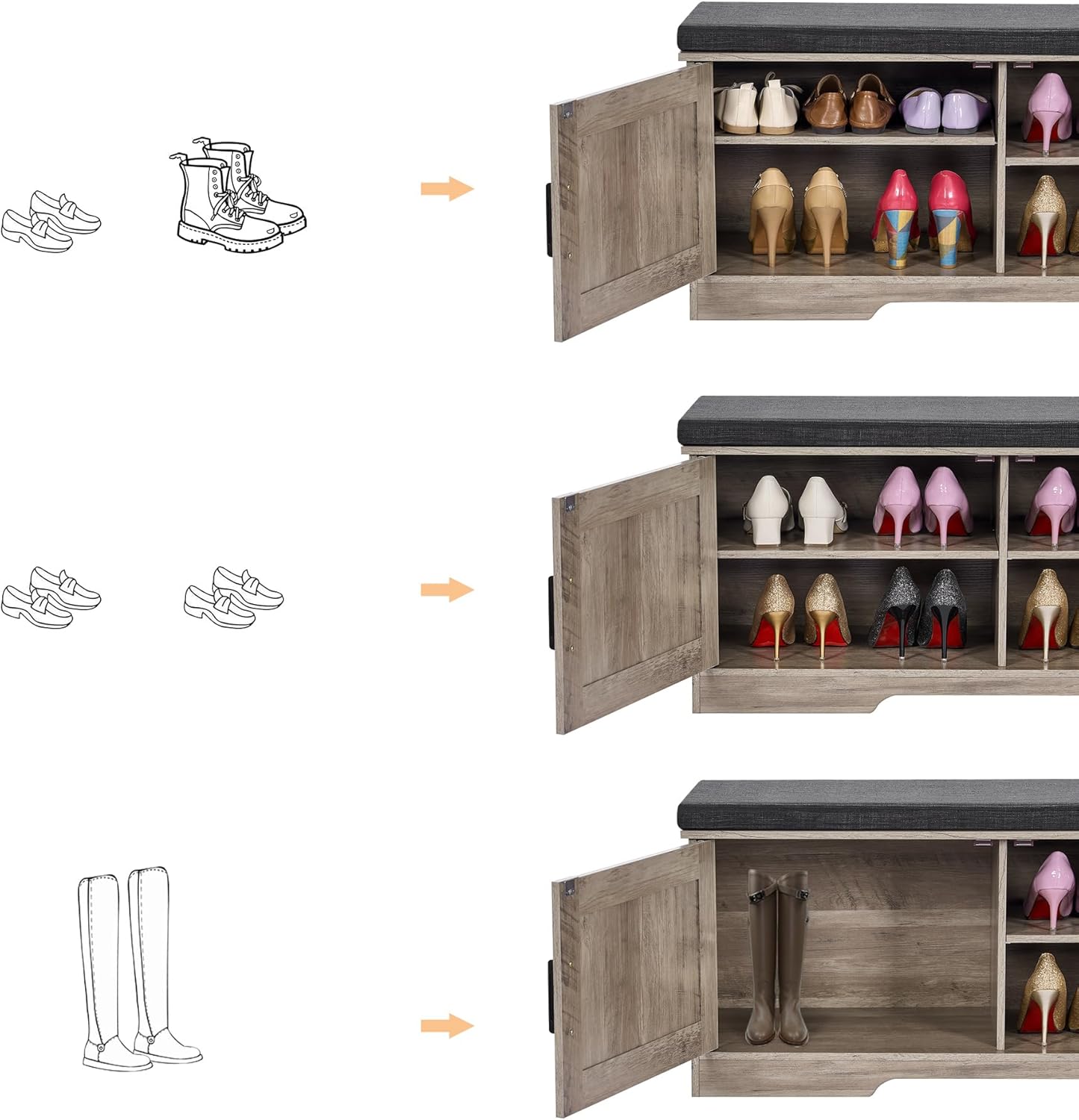 Keep Your Shoes Organized: The depth of bench is 13.8 inches, which makes it easily to put in your shoes, meanwhile shoes of various heights can be placed by adjusting middle movable boards. The bench doors design ensures not only your privacy, but also a tidy space
