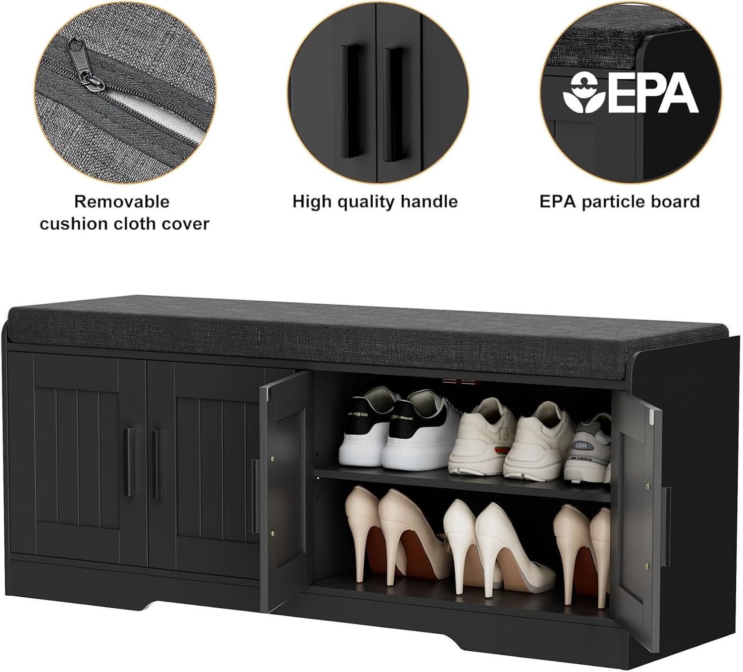 2-Tier Storage Bench, Shoe Bench with Thickened Padded Seat Cushion, Entryway Bench with 4 Doors, Adjustable Shelf, 13.8″ D x 45.3″ W x 18.5″ H, for Entryway, Living Room, Bedroom, Black