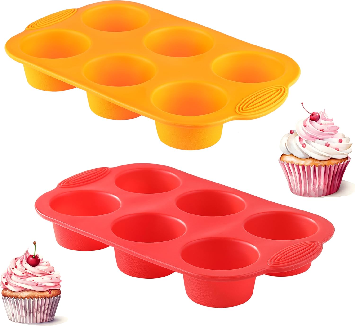 2PCS Silicone Muffin Cupcake Pan Molds, 6-Cavity Non Stick Silicone Muffin Pans for Baking Muffin, Cupcakes, Brownies and More, Food Grade and BPA Free (Orange and Red)