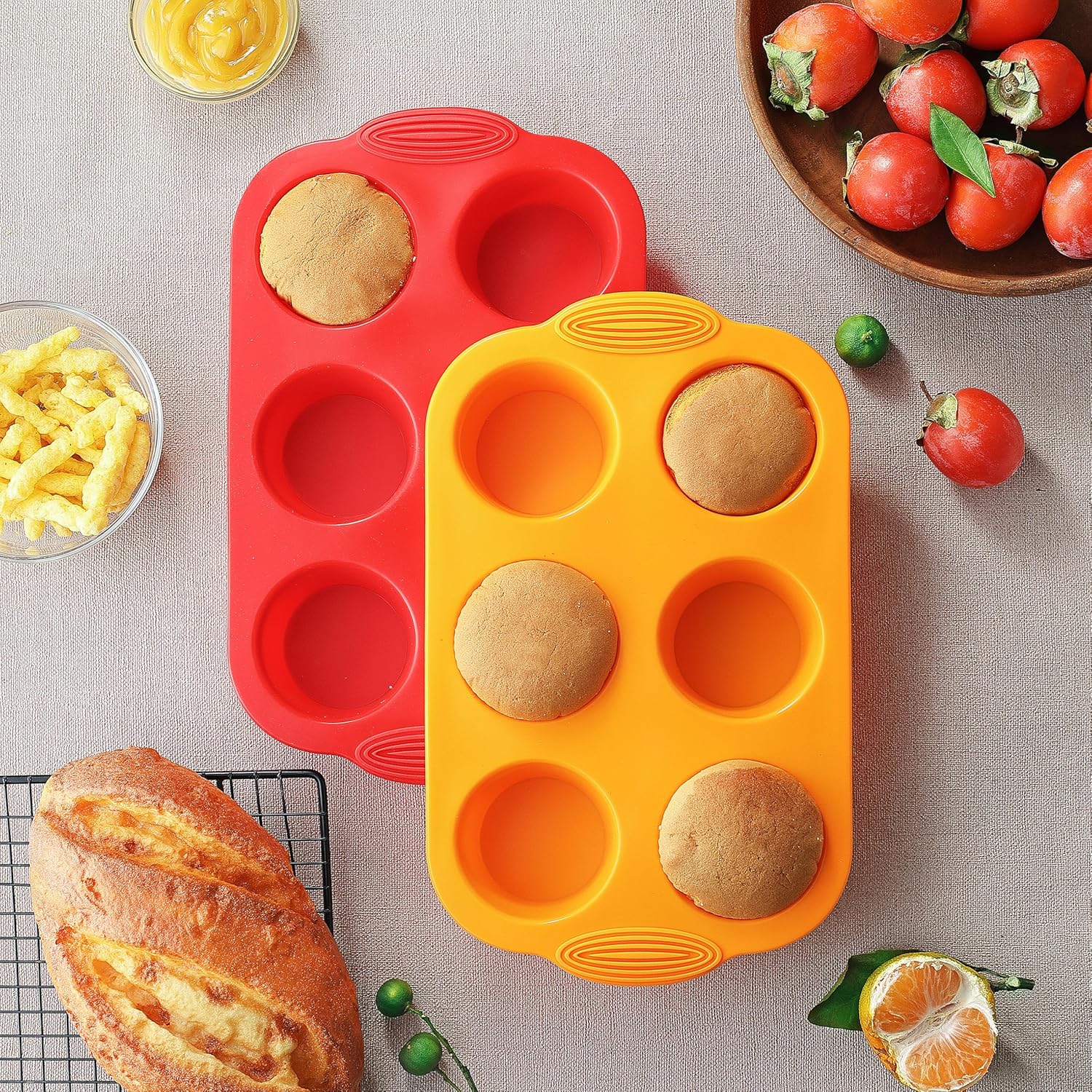 5. Flexible, Space-Saving Design with Fun Colors: The flexible silicone material not only allows for easy release of baked goods but also makes the silicone muffin pans easy to store. They can be folded or stacked without losing shape, saving valuable kitchen space. Plus, the vibrant orange and red colors of this silicone muffin cupcake pan add a fun and modern look to your kitchen, making baking even more enjoyable.