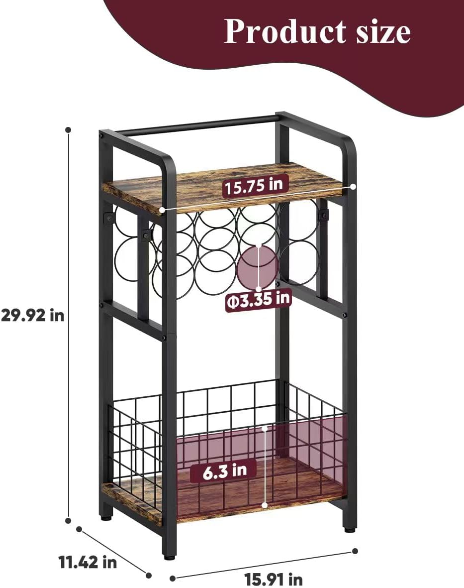 【3-Tier Wine Rack】: This small wine rack freestanding floor provides additional space for glasses, fruit platters and ice buckets. The middle layer can hold 8 bottles of your favorite red wine. The design of circular strip-shaped metal plate makes the wine rack stand easy to access and retrieve. The bottom of the wine holder can store wine bottles of different sizes, and the surrounding grids can effectively prevent them from tipping over.