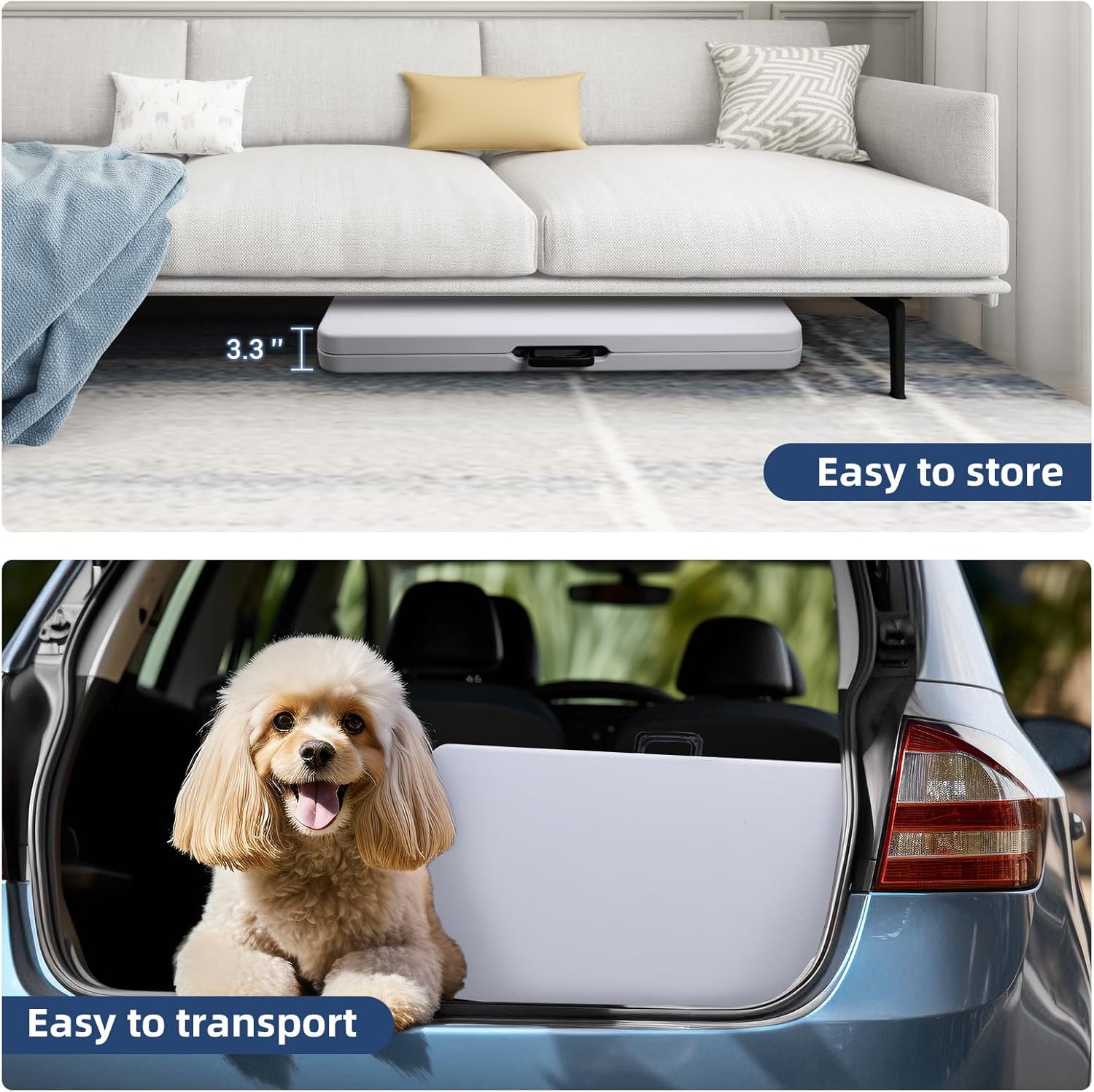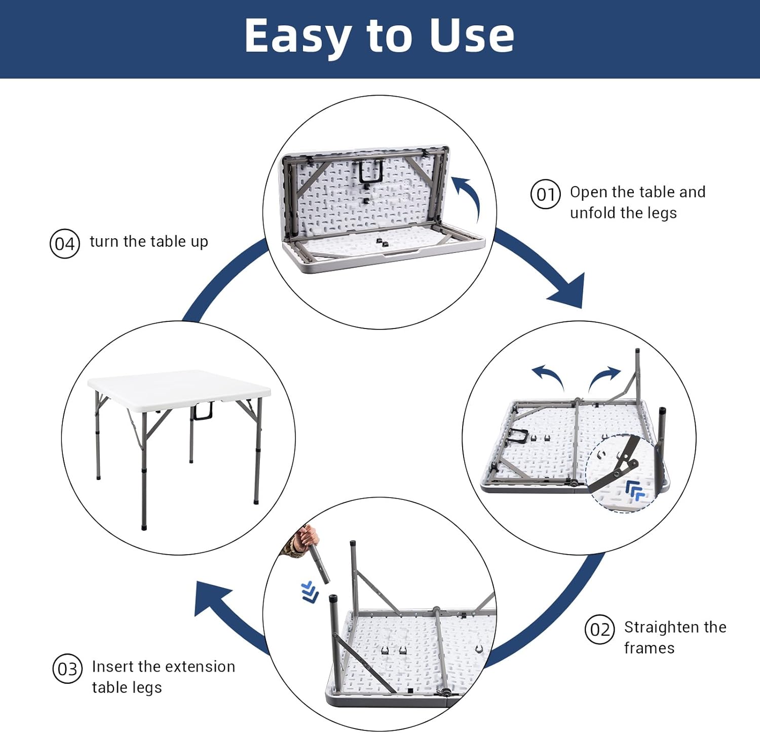 Practical & Lightweight: This plastic table is practical and portable, weighs19.8 pounds and folds to 34″ L x 17″ W x 3.3″ H , fitting easily in a car trunk. The unfolded size is 34″ L x 34″ W x 29″ H, has enough space to accommodate about 4 adults