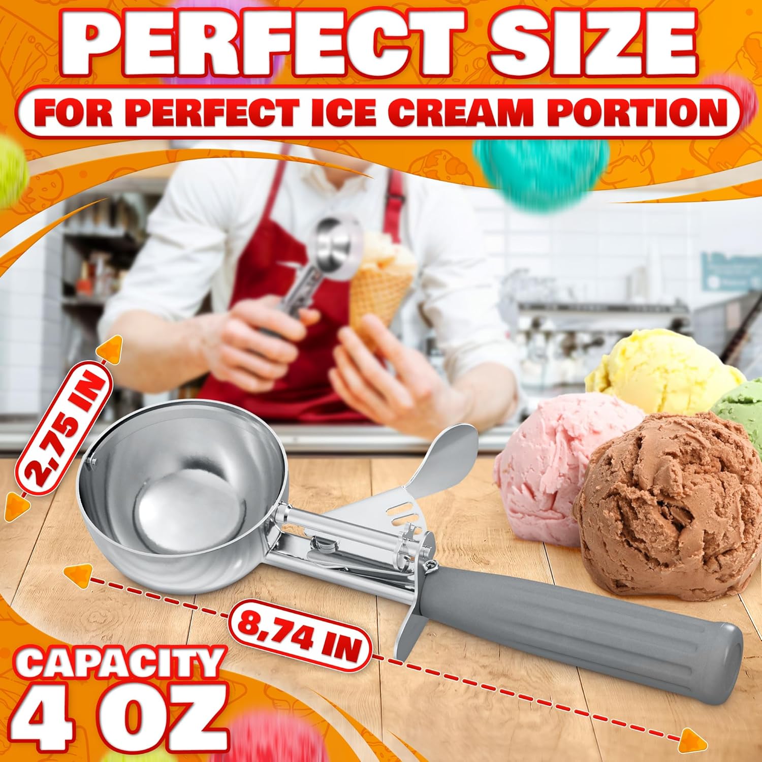 Elegant Design: Our 4oz ice cream scooper with a trigger measures 8.74 inches in length and 2.75 inches in diameter, ensuring efficient and easy scooping. The trigger ice cream scoop features a handle with a secure grip.