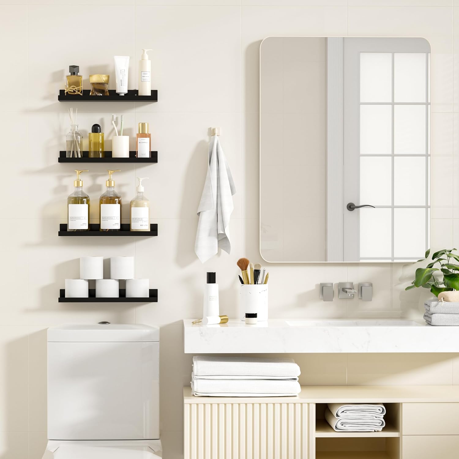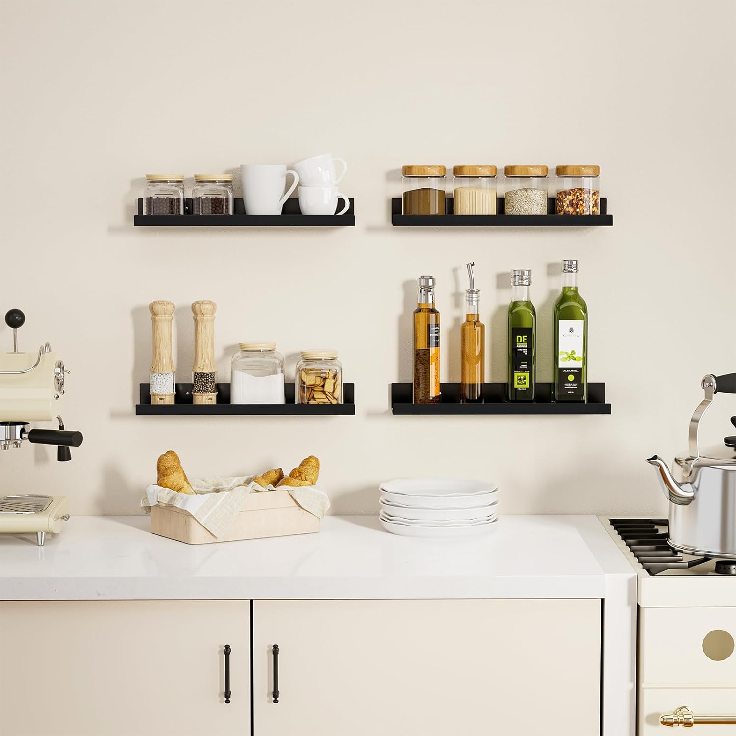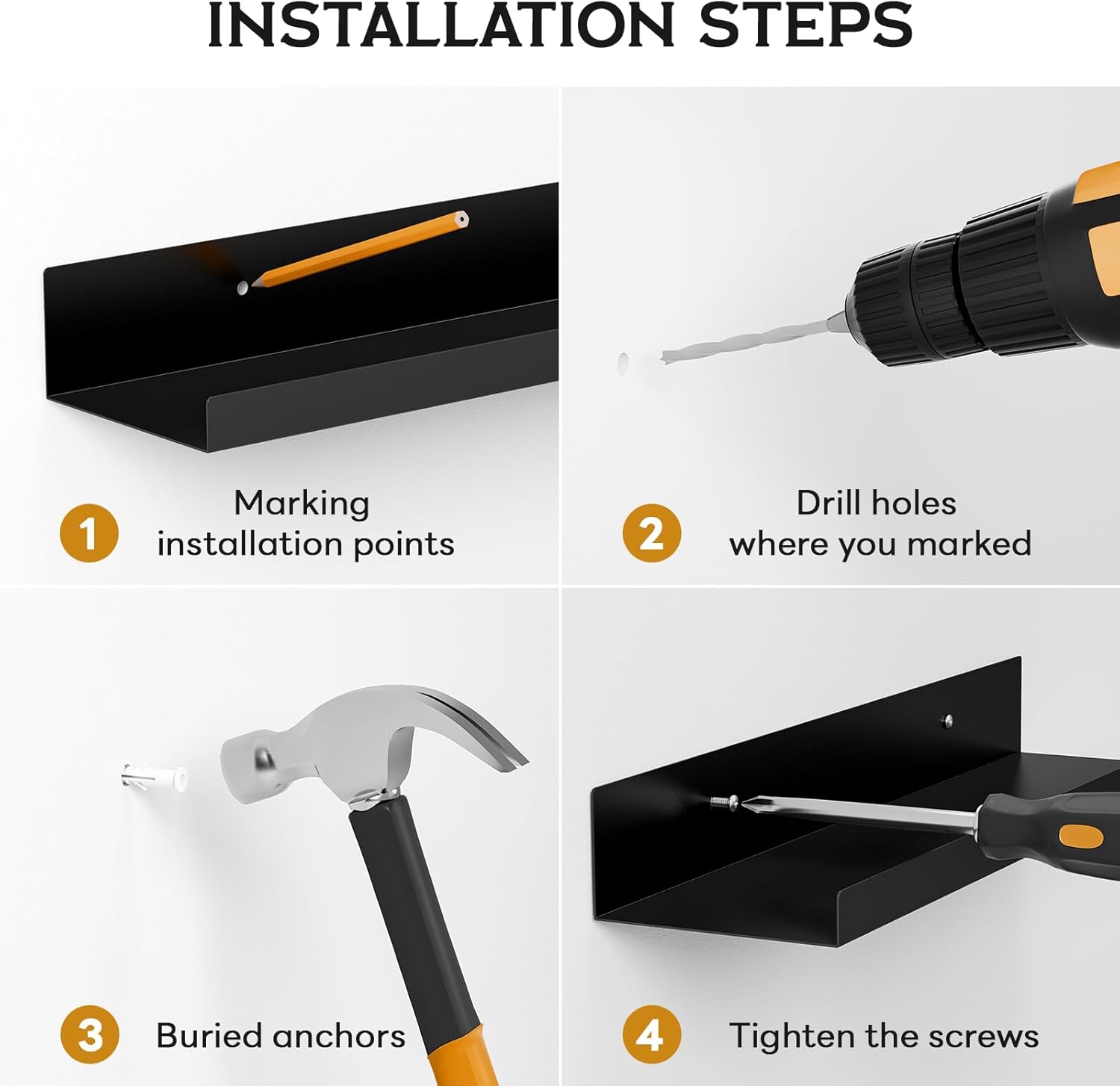 【Sturdy and Durable】Our black floating shelves are crafted from metal with high strength and hardness. They are capable of supporting heavy items and are not prone to deformation or damage. Whether you place kitchen spices or bathroom toiletries and cosmetics on them, they can hold the items steadily. Even after long – term use, there will be no issues like loosening or collapsing