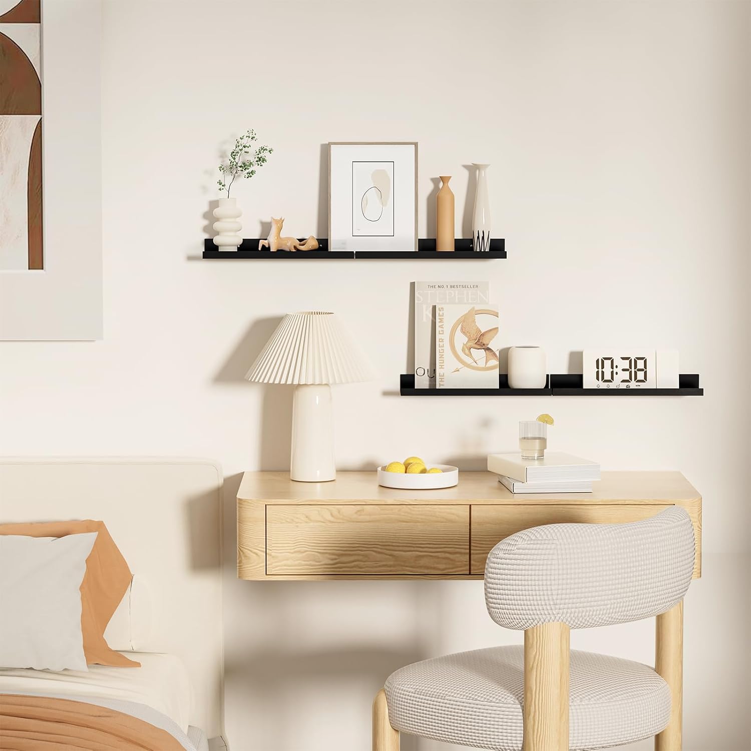 【Efficient Space Utilization】Our floating shelves for wall make the most of vertical space. You can hang various items on the wall, such as candles, perfumes, picture frames, handicrafts, and books. For small living spaces or areas with a lot of items, like kitchens, bathrooms, bedrooms, living rooms, and balconies, these shelves effectively increase the storage area