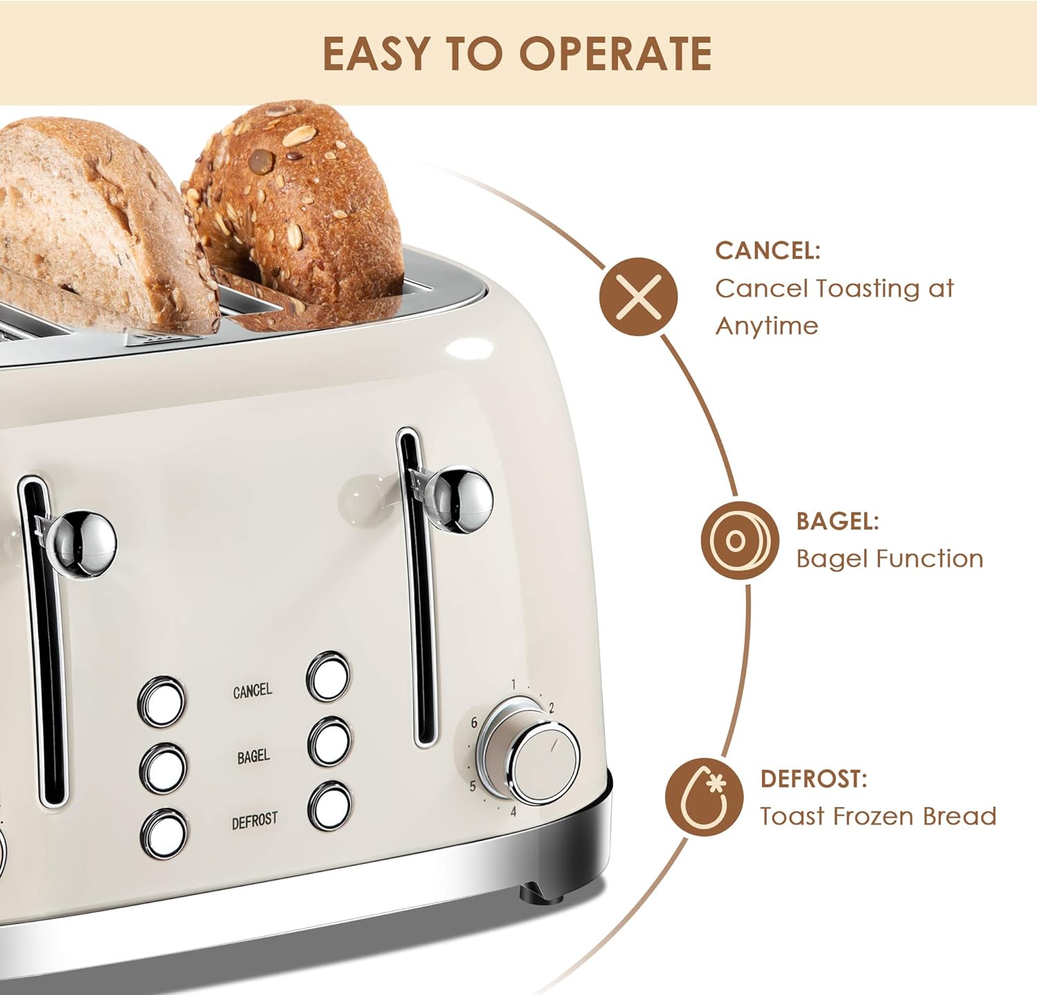 4 Slice Toaster Roter Mond Retro Stainless Steel with Bagel Defrost Cancel Function, 6 Browning Settings, Extre Wide Slot and Removable Crumb Tray, Cream, ST033