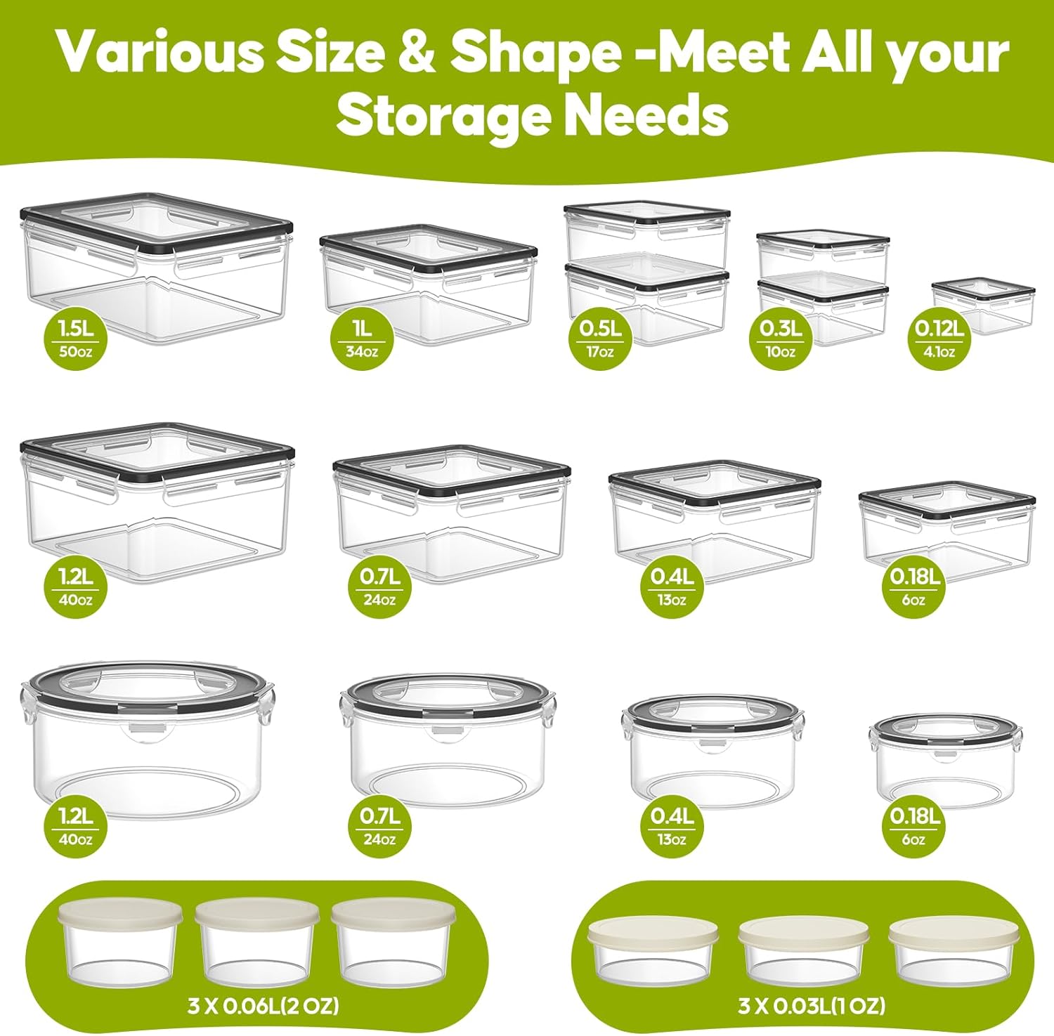 All-in-One Storage Set for Every Kitchen Need – This 21-pack airtight food storage container set includes: 7 rectangle containers (1X 51OZ, 1X 34 OZ, 2X 17 OZ, 2X 10 OZ, 1X 4OZ), 4 round containers (1X 40 OZ, 1X 24 OZ, 1X 13.5 OZ, 1X 6.1 OZ), 4 square containers(1 X 40 OZ,1 X 23 OZ,1 X 13 OZ,1 X 6 OZ), and 6 round sauce cups (3X 2 OZ, 3X1 OZ). From sauces and snacks to bulk meal prep and leftovers, our versatile sizes offer the perfect fit for your kitchen organization