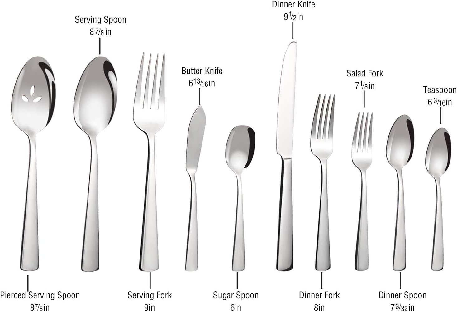 Ergonomic Design Size and Weight: Not too heavy or too large to grasp, not too light or too small to bend, forget the silverware and enjoy dinners. These stainless steel silverware flatware set comes with 8pcs each: dinner fork, dinner spoon, dinner knife, teaspoon, salad/dessert fork, plus 1pc soup/cereal spoon, 1pc serving fork, 2pcs serving spoons, and 1pc sugar spoon
