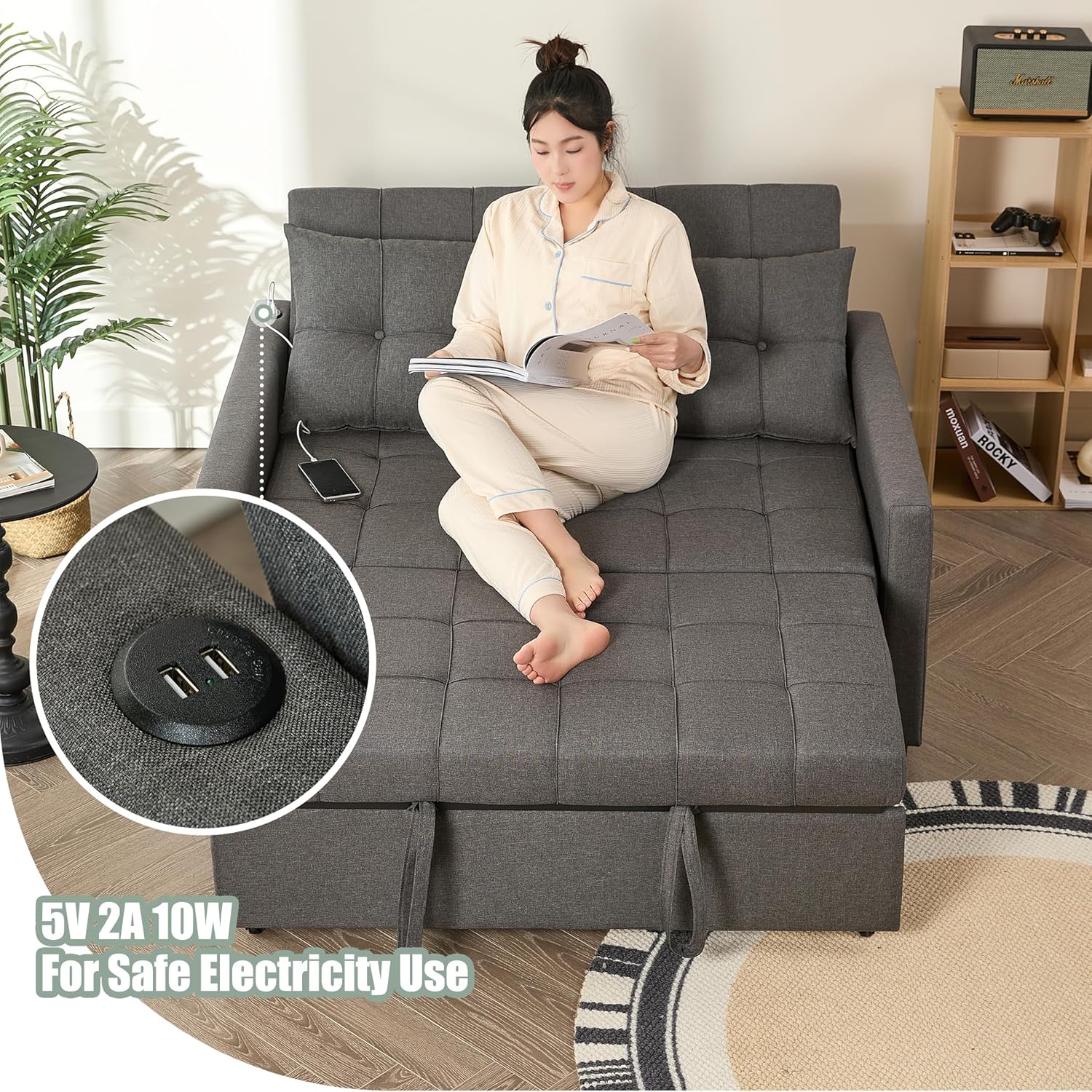 Premium Material: This Convertible Sofa Bed is built with a sturdy steel frame, providing exceptional support and long-lasting durability. And it has undergone rigorous testing before leaving the factory—its key components are proven to withstand over 10,000 uses. Equipped with USB ports on the side (5V/2A, 10W), this sleeper sofa allows for safe and reliable device charging, making it perfect for everyday use.