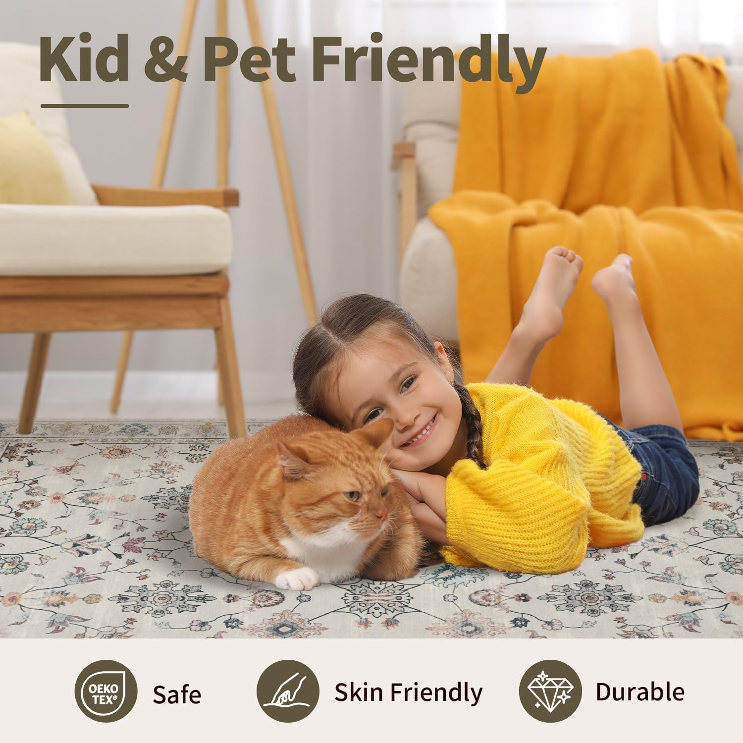 🌷【Kids and Pets Friendly】: Made from ultra-soft faux wool, this boho rug feels like walking on clouds and skin-friendly for kids and pets. The low-pile design prevents pet hair from getting trapped, and stops children or pets chewing or scratching. The non-slip backing ensures safety during play. Tips: Don’t worry about creases—just unroll the rug and walk on it, the creases will disappear in a few days