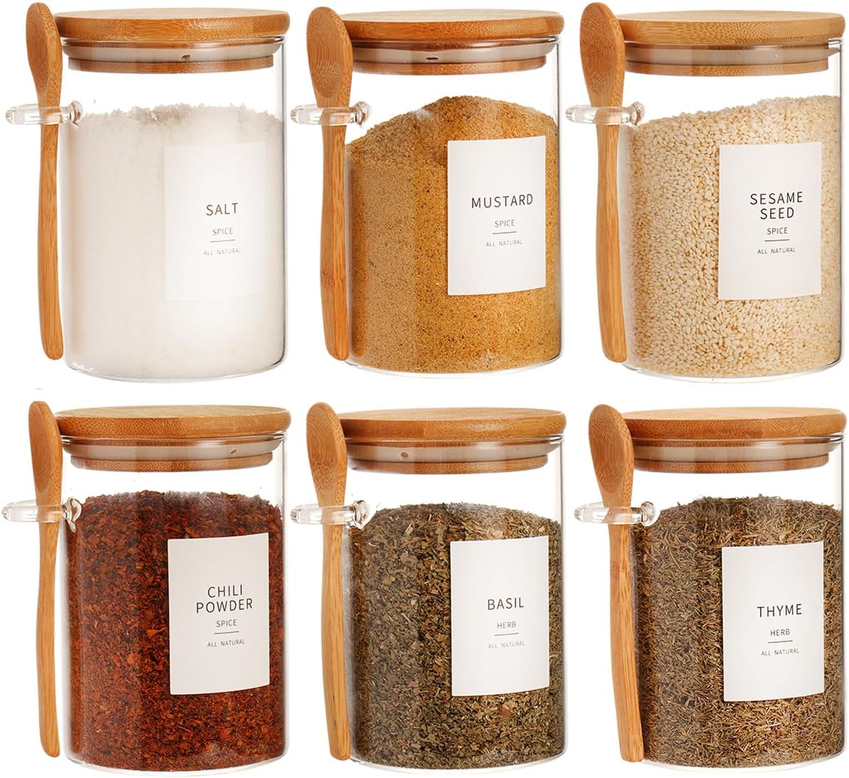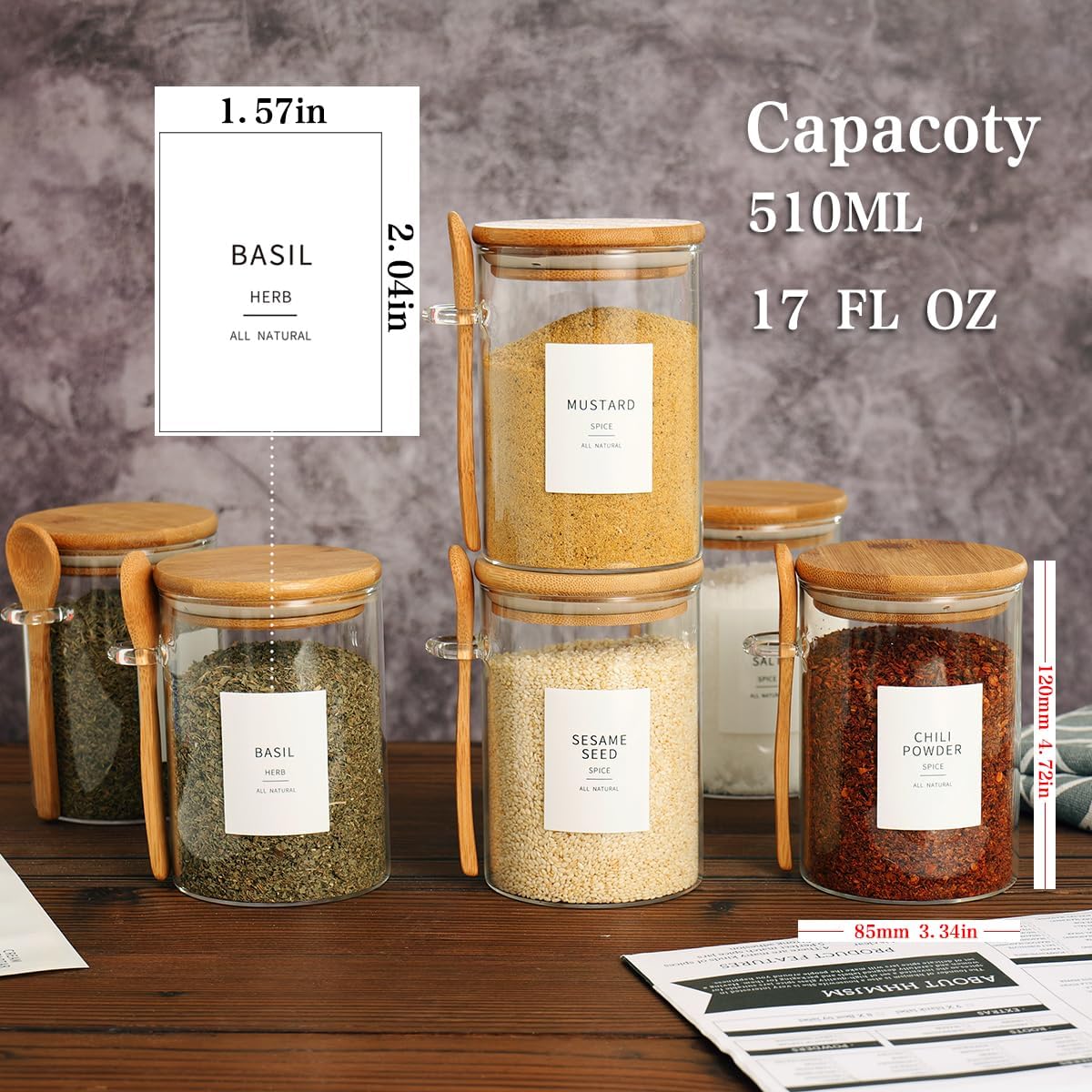 6 Pcs Glass Jar with Bamboo Lid and Spoon – 17 oz Large Sugar Container with 148 Kitchen Pantry Spice Jar Labels Preprinted – Glass Containers with Wooden Lids Hold Coffee, Tea, Candy