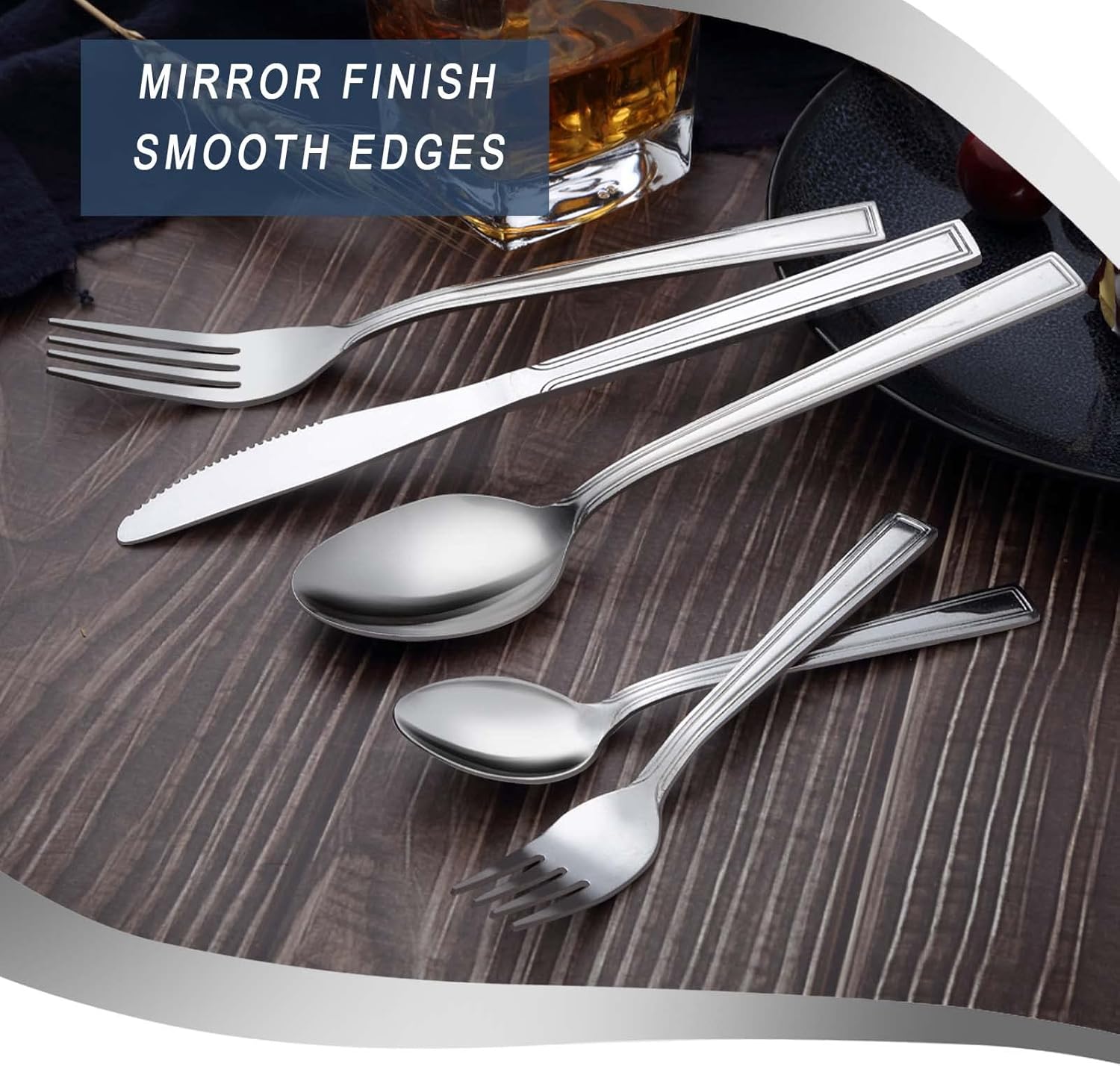 【Sturdy and Dishwasher Safe】These stainless steel silverware sets are made of high quality stainless steel, which are very sturdy, corrosion resistant and will not produce residues or odors like other stainless steel silverware set. Hence these flatware sets are easy to clean and dishwasher safe, saving you dishwashing time in your everyday life