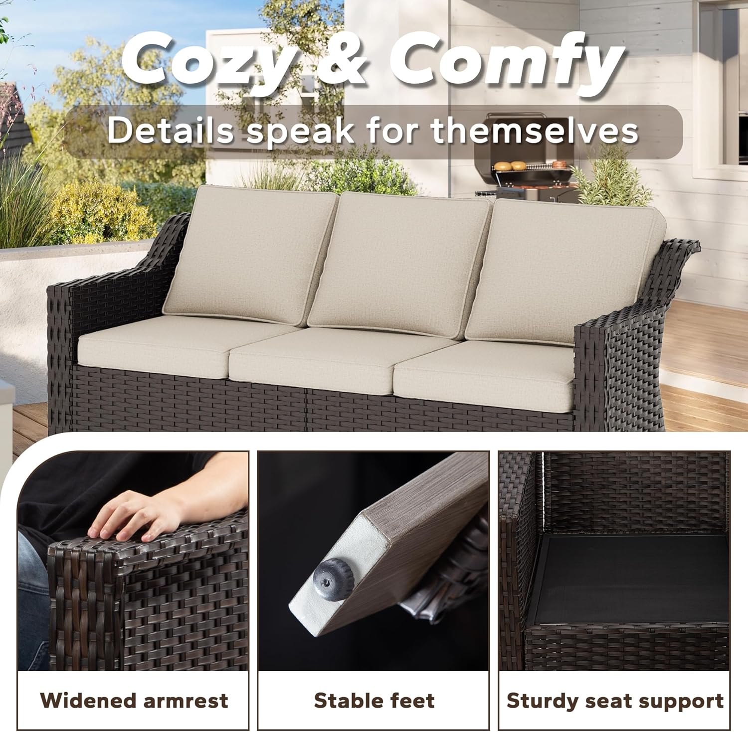 DEEP SEATING & SPACIOUS ROOM: Patio couch is designed with an extended seat panel, the comfy sofa is like a snug to you while sitting on. There will be plenty of space left even with 3 people on this couch, so you don’t have to worry about rubbing each other’s shoulder