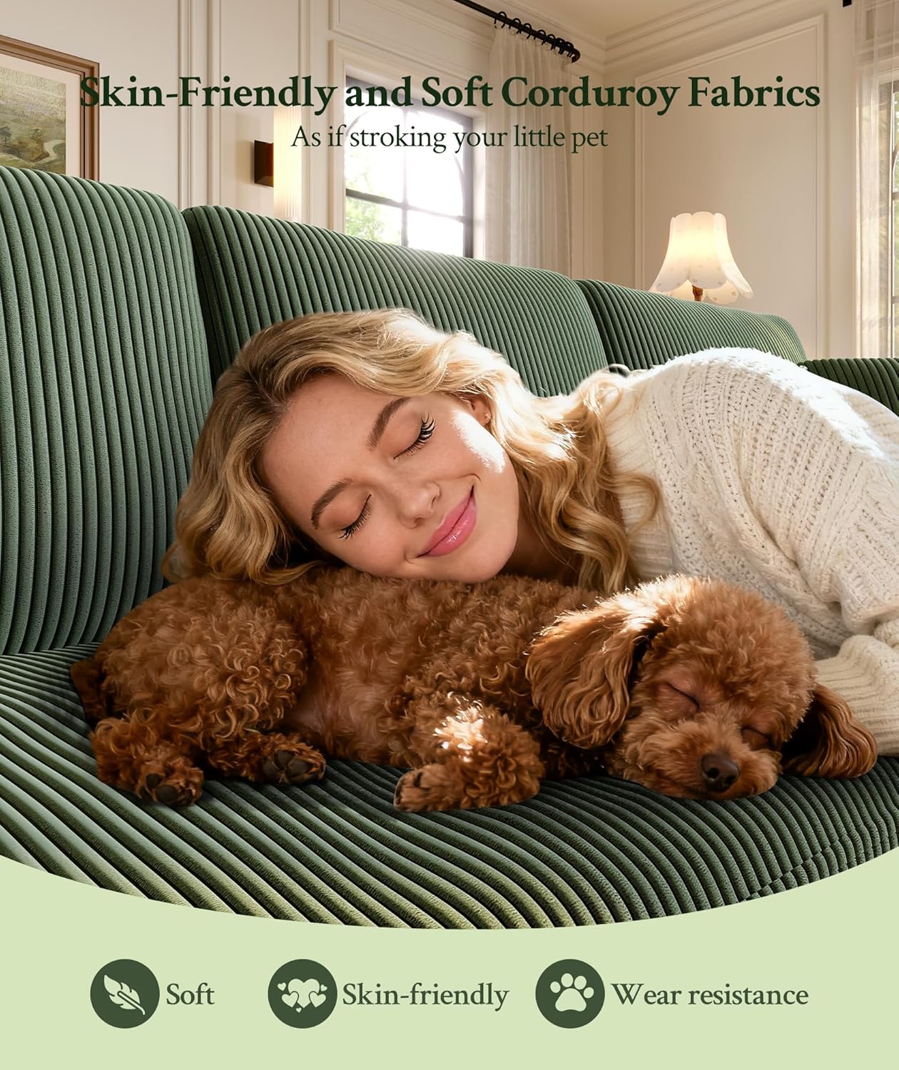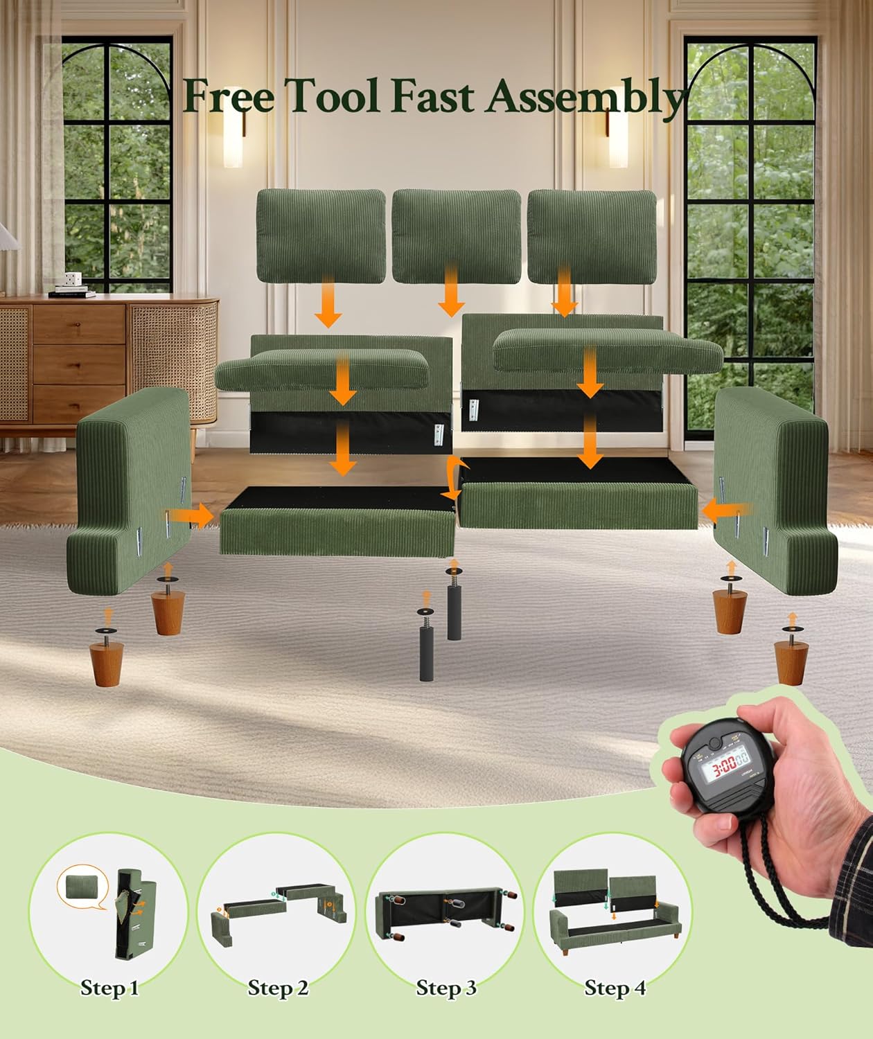 [Minutes to Assemble, Seconds to Refresh] Green Couch features a clever tool-free assembly design, allowing to set up your cozy retreat in just a few minutes. For daily peace of mind, both the seat and back cushion covers are fully removable and washable. This thoughtful design ensures that spills or pet dander are no longer a stress, keeping your couches for living room looking brand new with minimal effort.