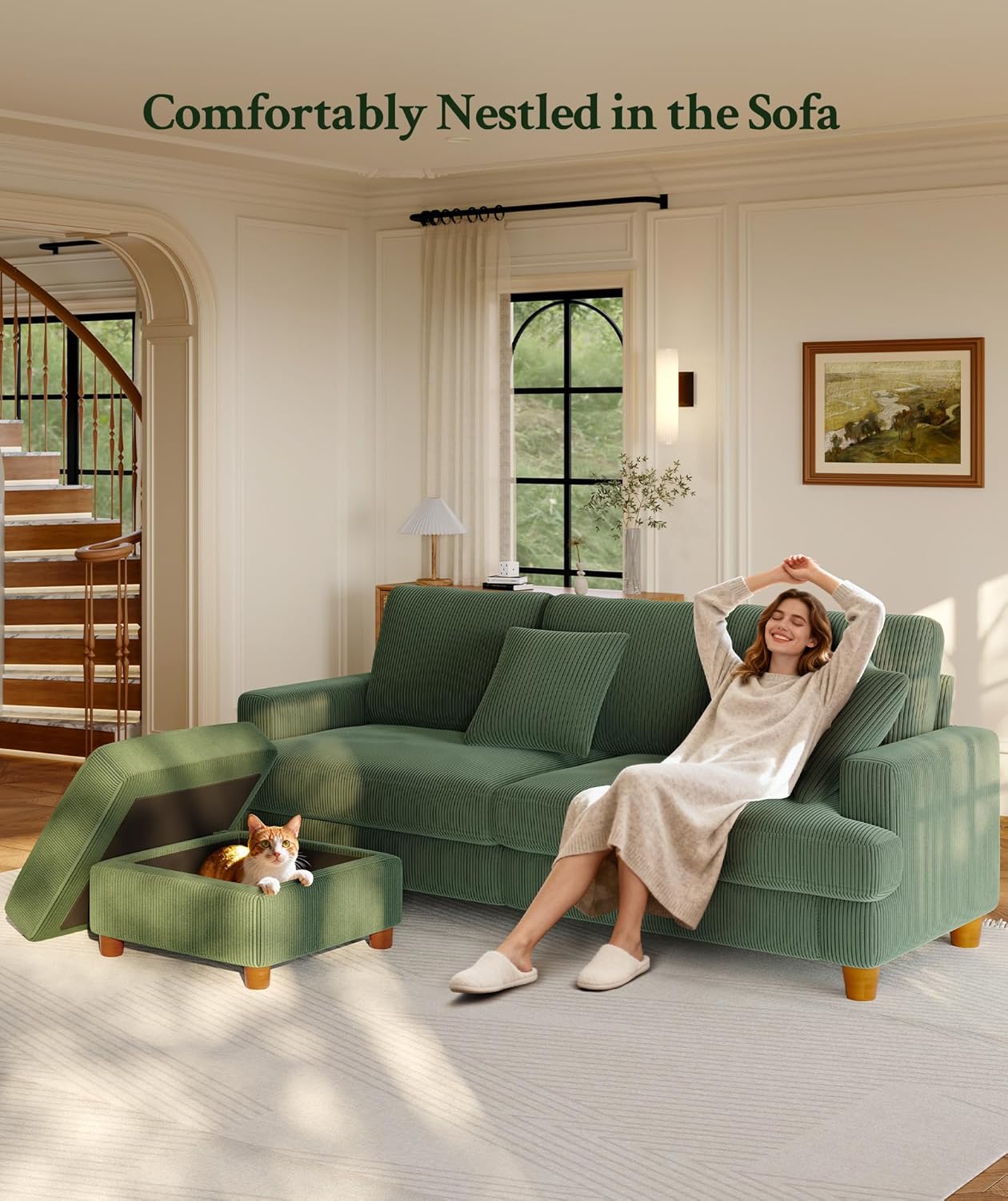 [Vintage Soul, Modern Softness] Experience the perfect blend of vintage charm and modern comfort. Corduroy Couch is upholstered in premium, skin-friendly corduroy fabric that is soft to the touch yet remarkably durable. The classic striped texture adds a sophisticated layer to your living room decor, creating a cozy sanctuary for morning coffee, afternoon reading, or midnight movie marathons.