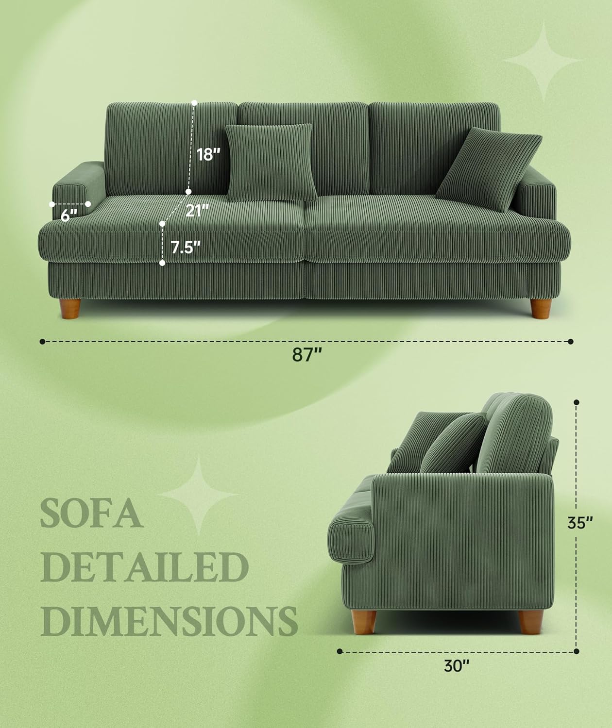couches for living room  green couch  sofas for living room  loveseat sofa couch  corduroy couch 18″ High Backrest