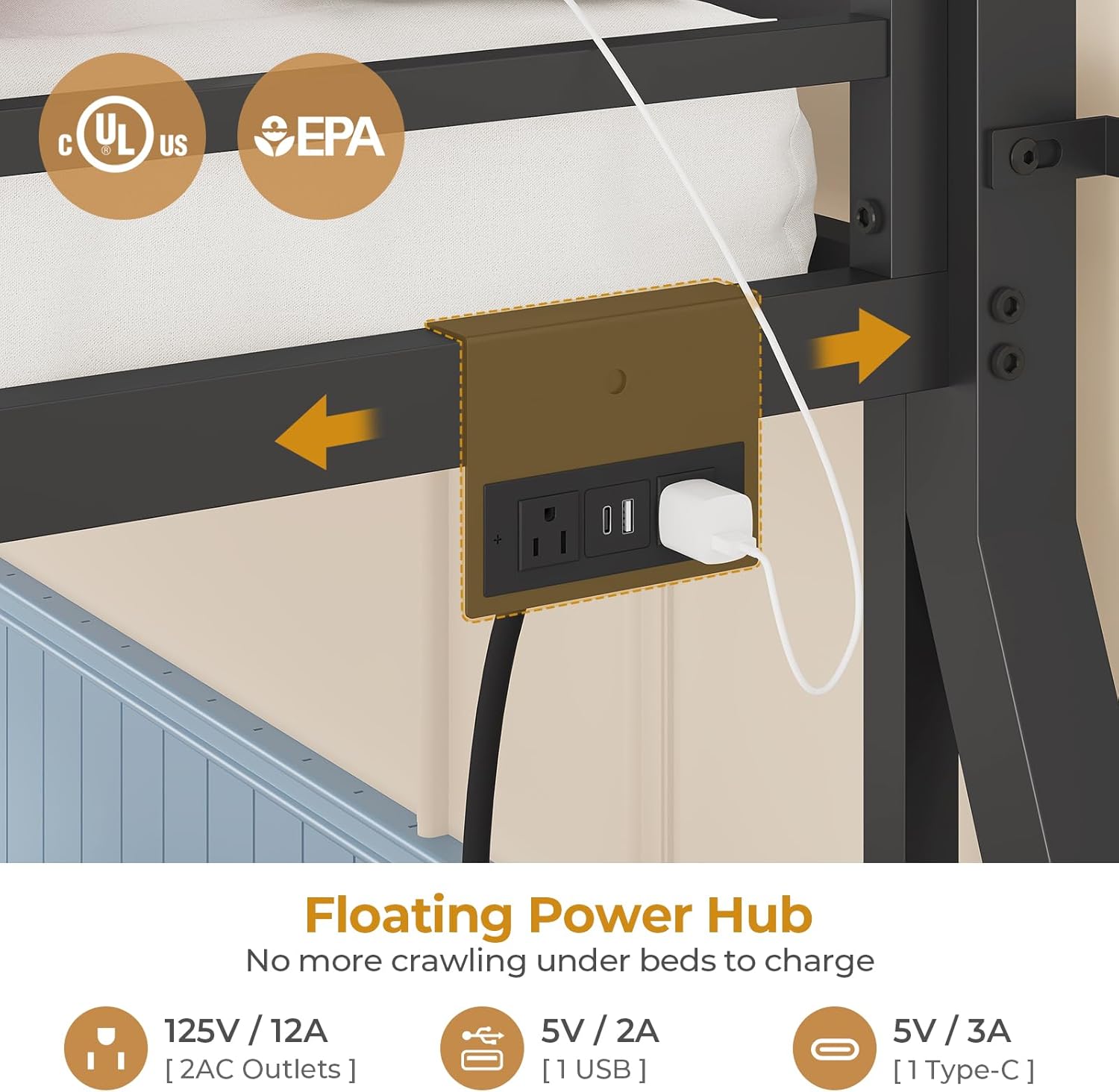 Floating Power Hub: The kids bed comes with a suspended power outlet. Two AC outlets, USB-A, and USB-C keep devices juiced up without cluttering the floor. Kiddo in the upper bunk now juice up their devices conveniently now