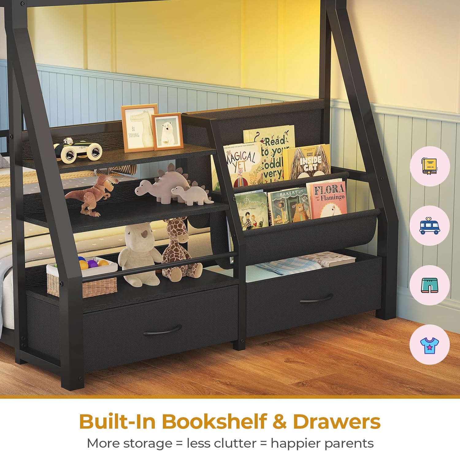Space-Saving Magic: This bunk turns any bedroom into a versatile space with 3-tier bookshelf, sling rack and 2 light-weight but durable drawers. Storybooks, stuffies, and PJs stay organized right by the bed. Ideal for siblings sharing a tight bedroom. Say goodbye to bedtime chaos and hello to smooth “5 more minutes, pleeeease” negotiations