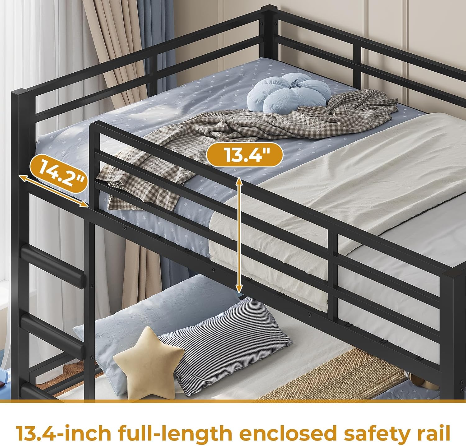 Safety First: Crafted with high quality, non-toxic powder coating steel, this kids low bunk bed is durable and super stable. Anti-toppling device adds to extra stability for wild dreamers. Top bunk has wrap-around rails for worry-free sleep, and the lower bunk comes with high headboard and footboard for added protection and steel legs to give extra support