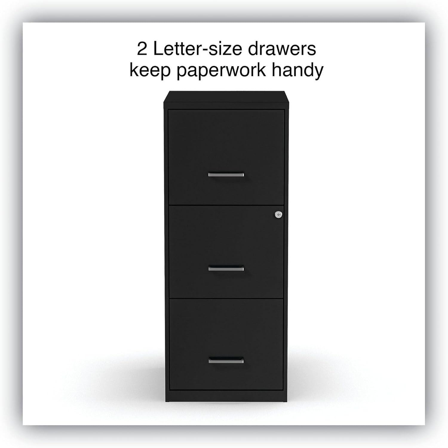 Keep important business records organized and close at hand with this three-drawer letter light duty vertical file cabinet. Ideal for workplaces of all sizes, this compact cabinet takes up minimal floor space and adds a contemporary touch to office decor with its sleek finish and polished handles. The Alera 3-Drawer File Cabinet is made with lightweight yet tough steel and includes a built-in lock to secure your files.