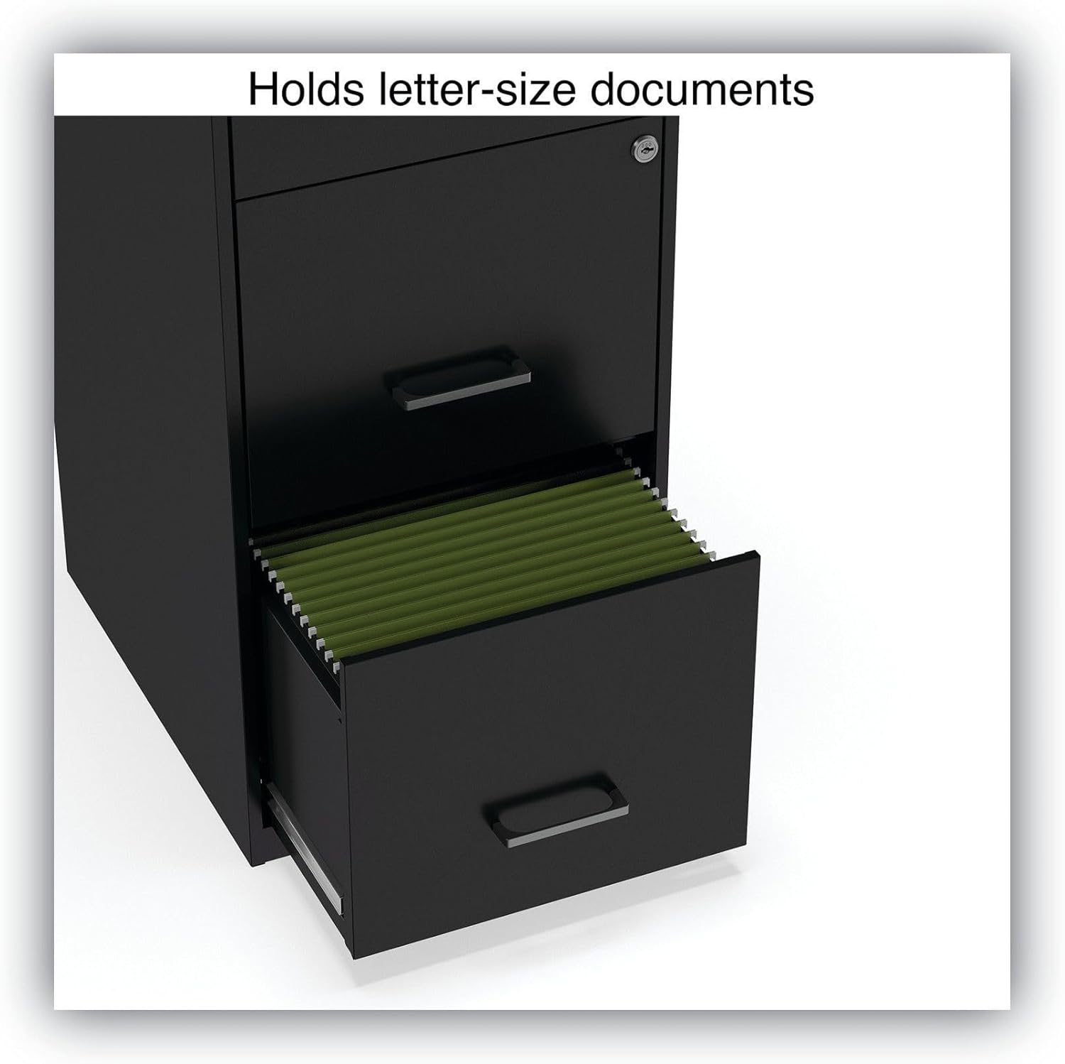 Three-drawer light duty filing cabinet holds letter size documents.