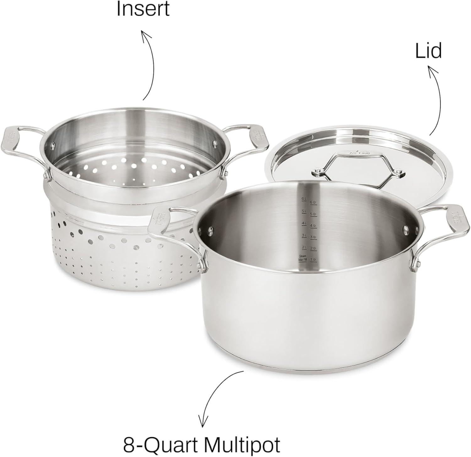 All-Clad Stockpot 8 qt Stainless Steel Multipot With Insert & Lid, Stainless Steel Pot, Induction, Oven Broiler Safe 600F Skillet, Professional Cookware, Silver