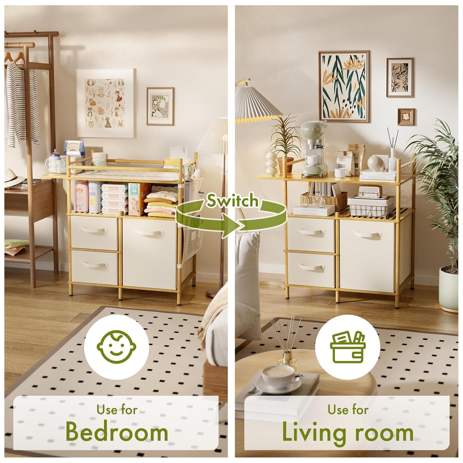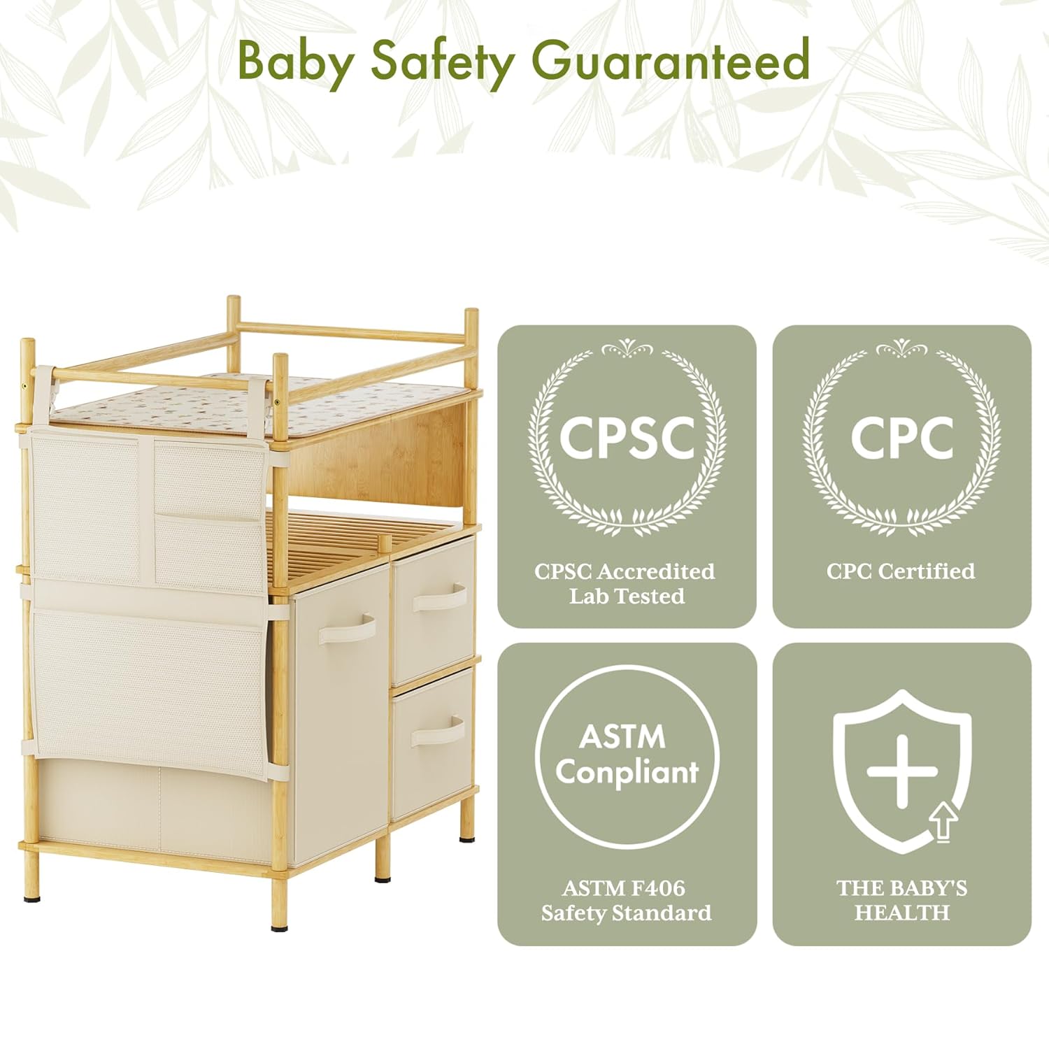 Sturdy Bamboo Construction: Crafted from 100% sustainable bamboo wooden, this baby changing table dresser with hamper combines environmental responsibility with exceptional durability. Baby diaper change table with reinforced frame ensuring stability and long-lasting durability, provides a solid and reliable space for diaper.
