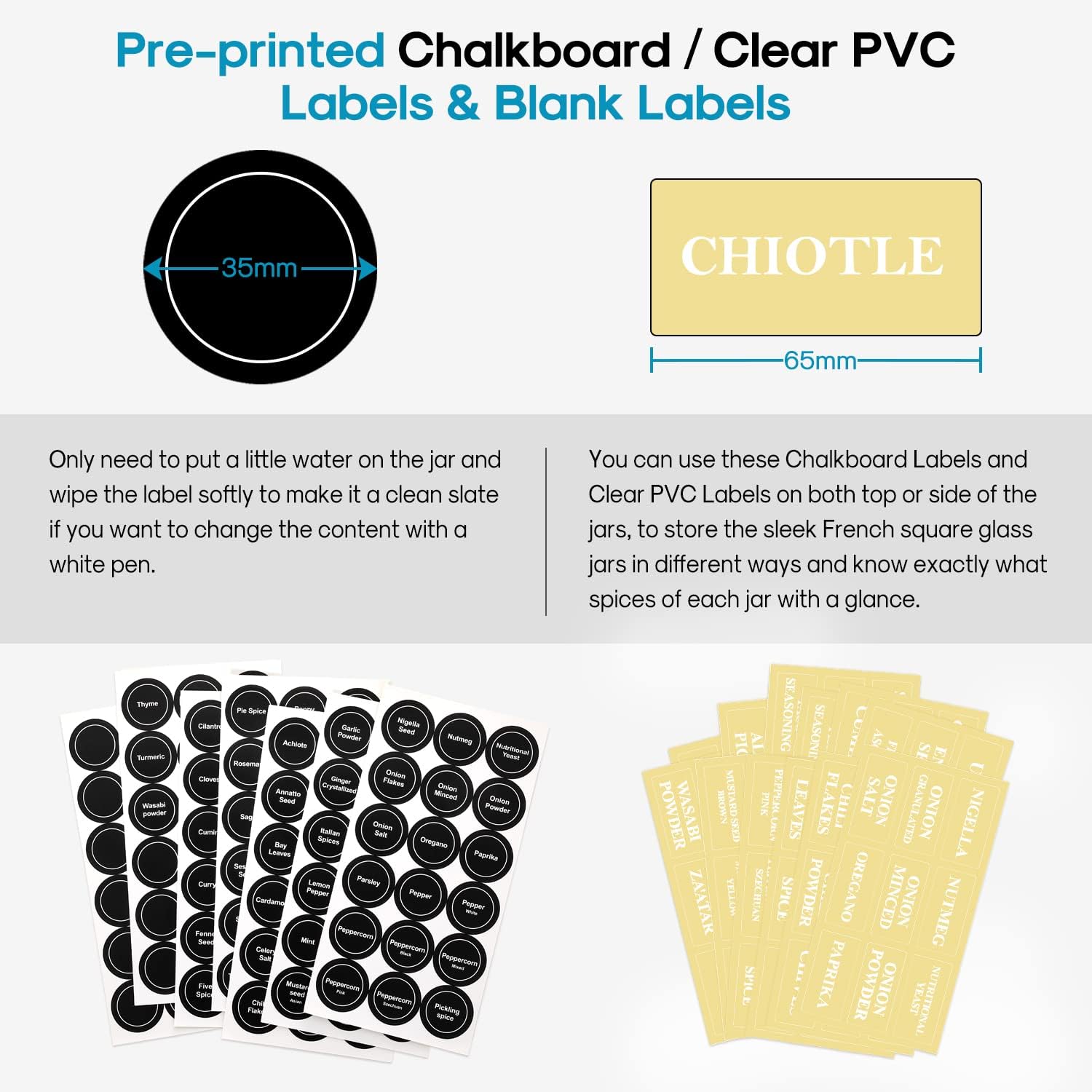 COMPLETE SQUARE SPICE BOTTLES SET» 14 Square Empty Glass Spice Jars, Shaker Lids, Metal Caps and 2 kinds of Waterproof Spice Jar Labels ( Pre-printed Clear PVC labels, Chalkboard Labels, and Blank Labels), a collapsible silicone funnel to help transfer spices, simplifying the refilling task!