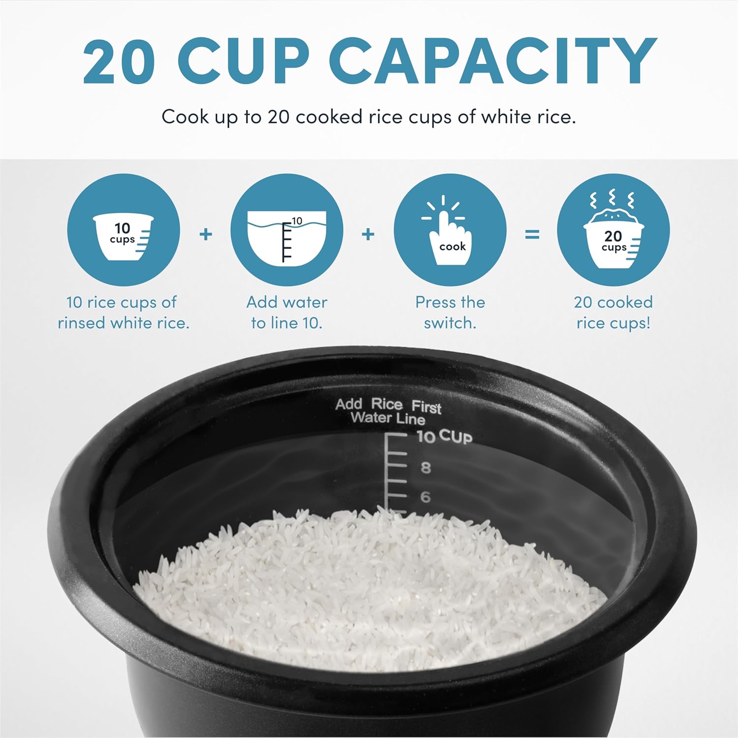 BIG RICE POT: This 5-quart rice cooker is perfect for big families. Pour 2 to 10 cups of raw rice inside, add water, flip the switch, and watch rice double in size while it cooks.
