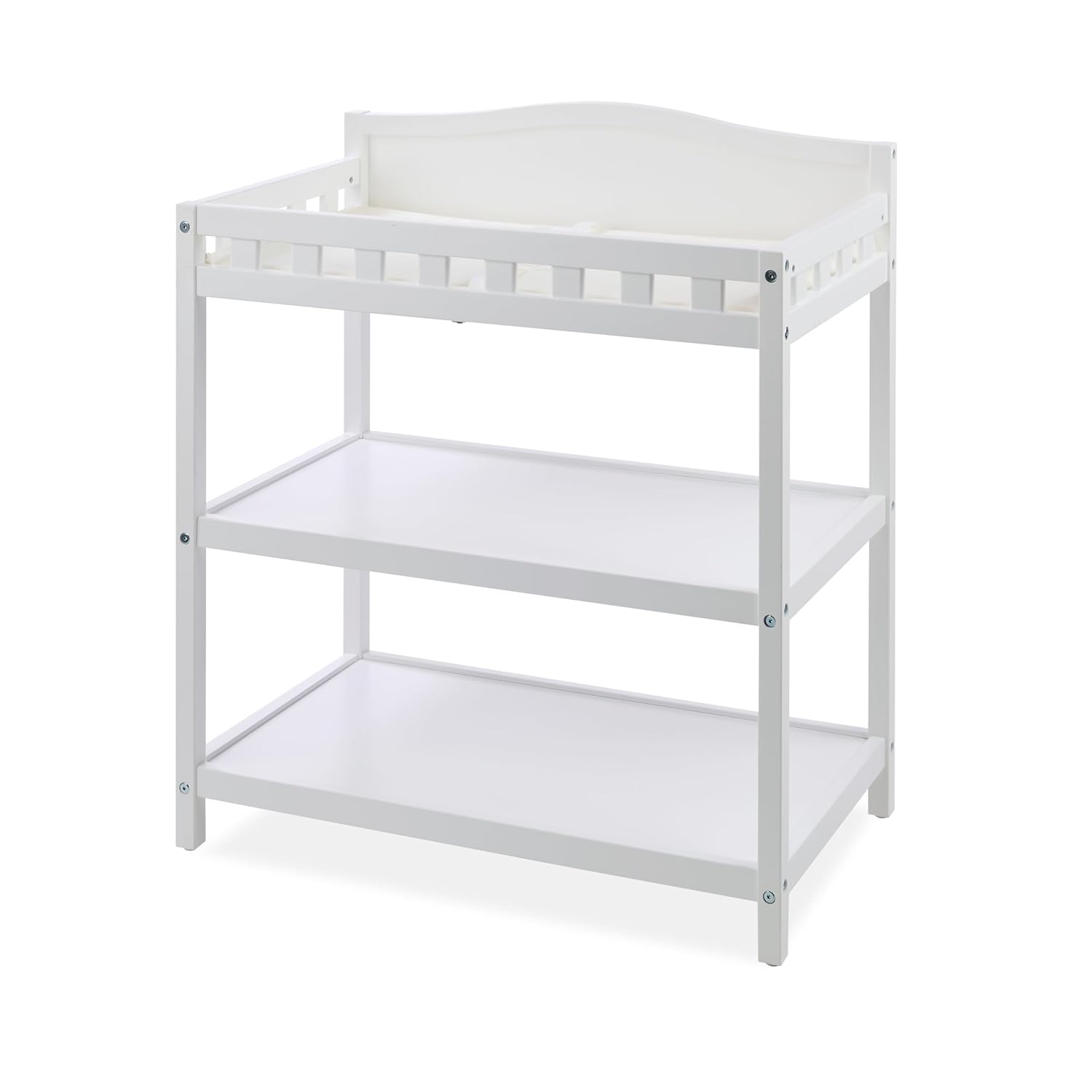 Badger Basket’s Simply Stylish Baby Changing Table is a sleek and simple diaper changing station that is a must-have for your baby’s nursery. The raised side rails provide a cozy and secure space for your baby during diaper changes and feature a beautiful classic design. With wide, open shelves, this registry must-have offers ample storage for all your diaper changing necessities such as diapers, wipes, diaper rash cream, towels, and more. The included water-resistant changing pad with an attached safety strap ensures a safe and convenient changing experience. Once baby has outgrown diapers, repurpose the table and utilize the wide open shelves for toy storage or as a bookshelf. Made from pine wood with MDF shelves, this sturdy changing table is easy to clean and safe for infants up to 30 pounds, making it a practical and stylish addition to your nursery decor. Metal support bar beneath the changing surface provides additional stability. Includes a polyurethane foam pad with vinyl cover. Overall changing table measures 33”L x 19.25”W x 37.5”H. Each shelf measures 17.25”W x 30.5”L x 11.25”H. Changing area measures 31”L x 17.25”W. Side rails measure 4.25-8”H. Waterproof changing Pad measures 31” L x 17.25” W x 1” H. Assembled weight 24.25 pounds. All measurements approximate. Wipe the table and changing pad clean with a damp cloth and mild soap as needed and dry thoroughly. Changing table is for use with children weighing up to 30 lbs. (13.6 kg). Adult assembly required. Illustrated assembly instructions included. Meets all currently applicable testing standards. Product includes a limited warranty of 30 Days Parts to the original purchaser. Product may vary slightly from shown and described. Props/accessories shown are for illustration purposes only and are not included with the product. Actual color/finish may vary slightly from screen display. This item ships in its original carton that may include a product photo.