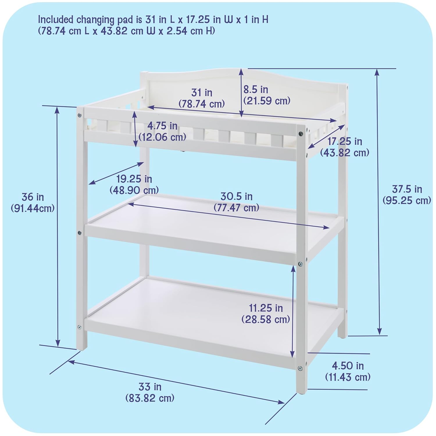 COMPACT CHANGING STATION WITH STORAGE- A space-saving solution for parents who want style, storage, and function in one nursery essential. Table: 33″ L x 19.25″ W x 37″ H. Pad: 31″ x 17.25″ x 1″. Shelves: 30.5″ L x 17.25″ W x 11.25″ H.