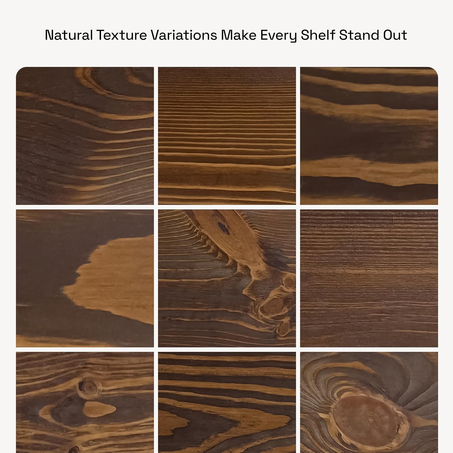 Natural Wood Floating Shelves: These real wood shelves are handcrafted from 100% solid pine, sized 16″W x 6.7″D x 1.2″H, showcasing the wood’s natural knots and stained for the perfect aged look