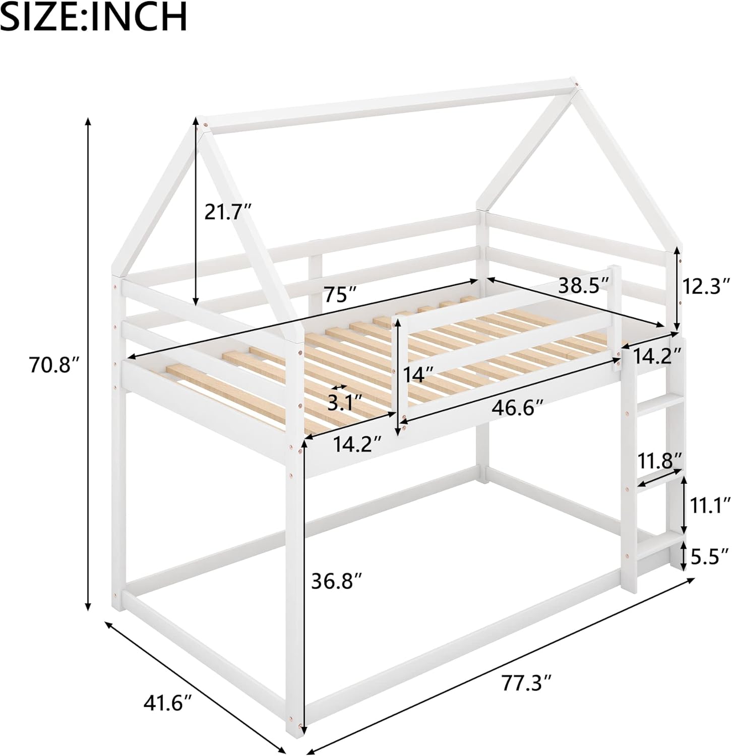 Bellemave Twin Over Twin House Bunk Bed for Kids,Floor Low Bunk Beds with Ladder and Guardrails,Solid Wood Twin Size Bunk Bed for Girls Boys,Twin Over Twin,White
