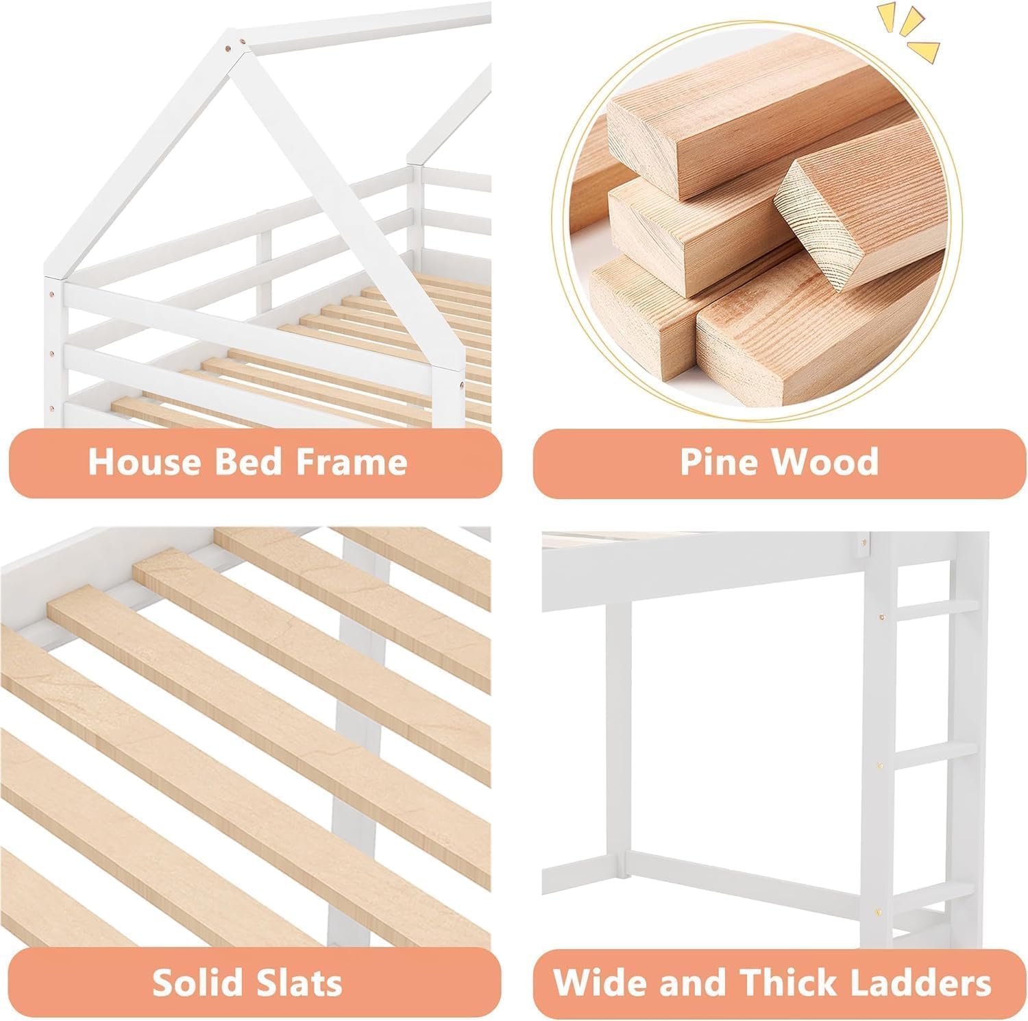 🥇【Safer for kids】This twin house bunk bed has built-in 3 wide and thick ladders for easy access to the upper bed.The steps of each ladder are fixed with screws,which is very safe.Full-length guardrails on the upper bunk prevent accidental falls.