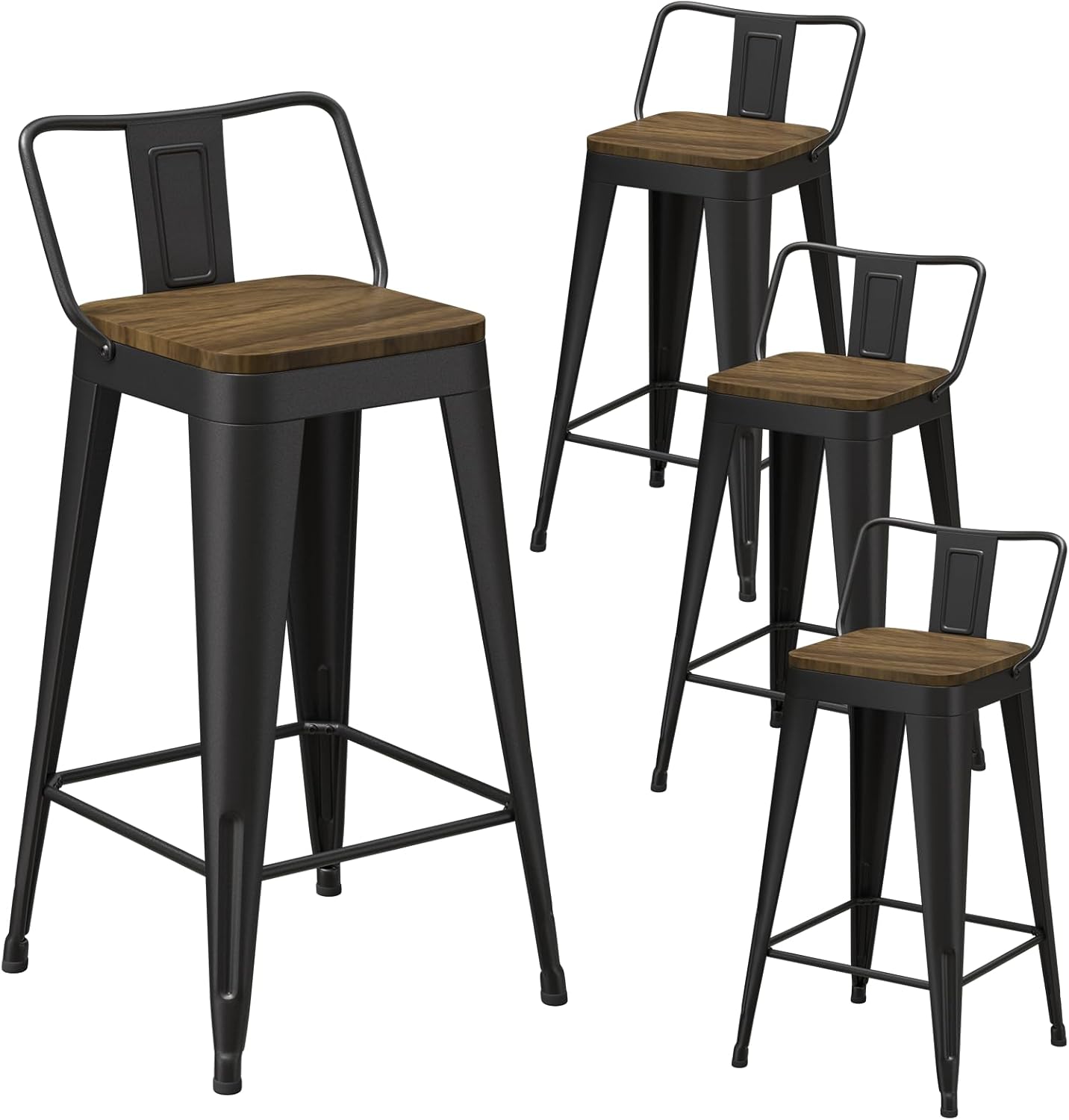 Black Bar Stools Set of 4, Metal Bar Stools with Wooden Seat, Modern 24”Counter Height Barstools with Low Back