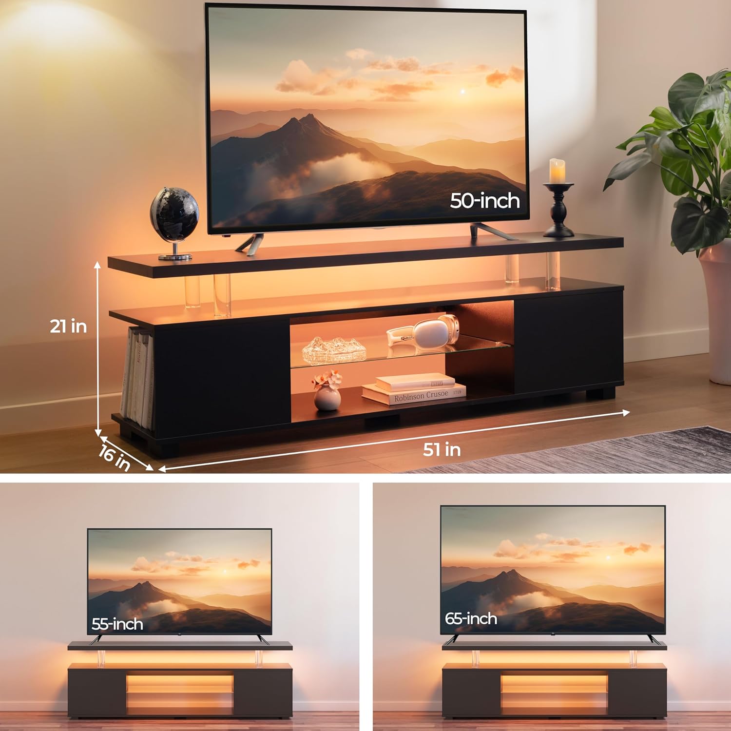 Black TV Stand 65 inch,LED TV Stand for Living Room,Glass Entertainment Center TV Stand, TV Console Tables for Living Room,Bedroom,Home Office