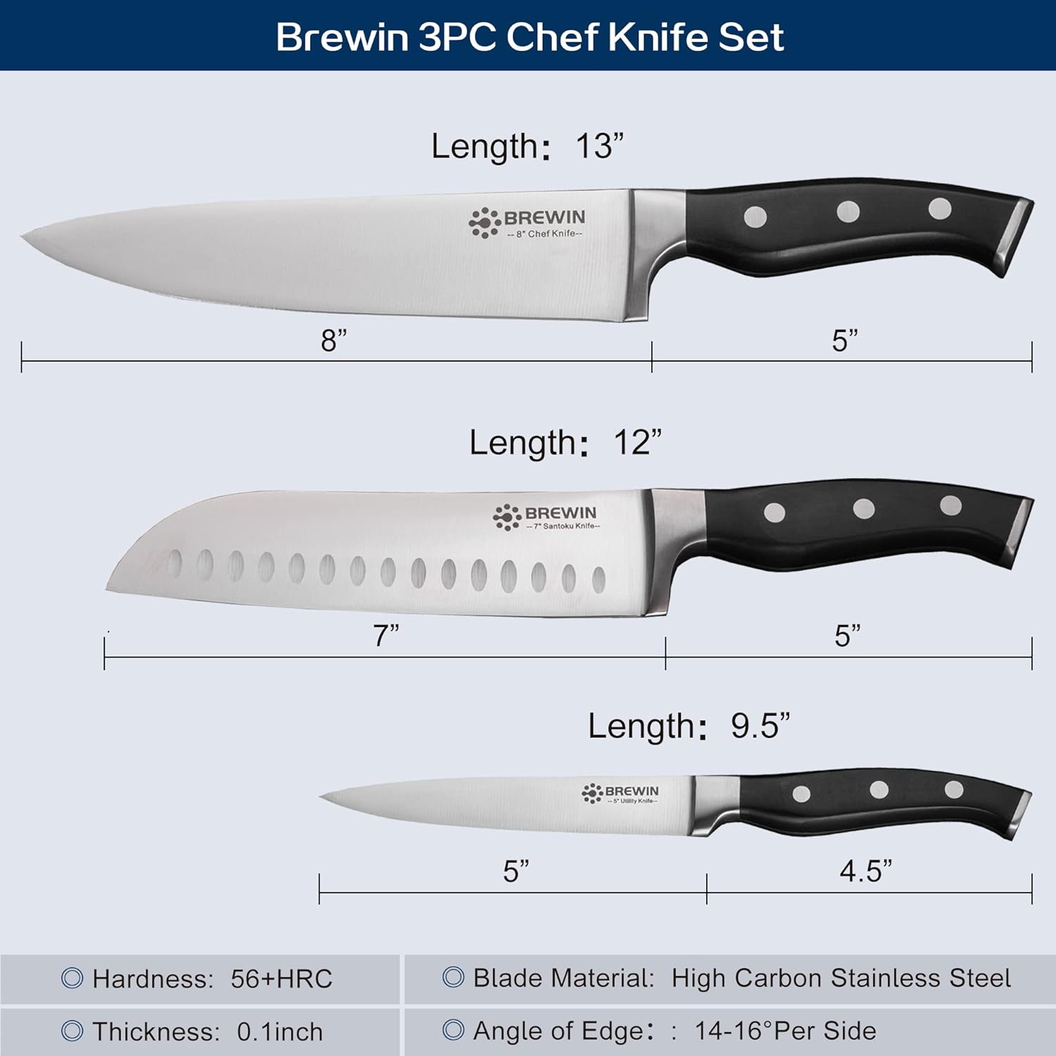 Brewin Professional Kitchen Knives, 3PC Chef Knife Set Sharp Knives for Kitchen High Carbon Stainless Steel, Japanese Cooking Knife with Gift Box
