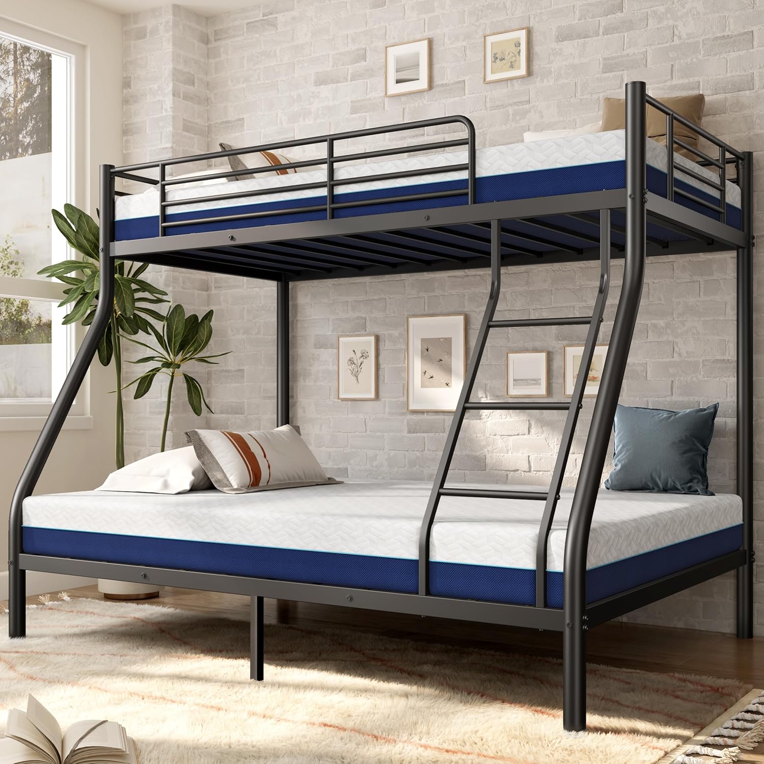 Bunk Beds Twin Over Full Size with 6” Mattresses Included, Heavy Duty Metal Bunk Bed Frame with Angled Ladder for Teens and Adults, for Spaces-Saving, Smooth Rounded Edges, Black
