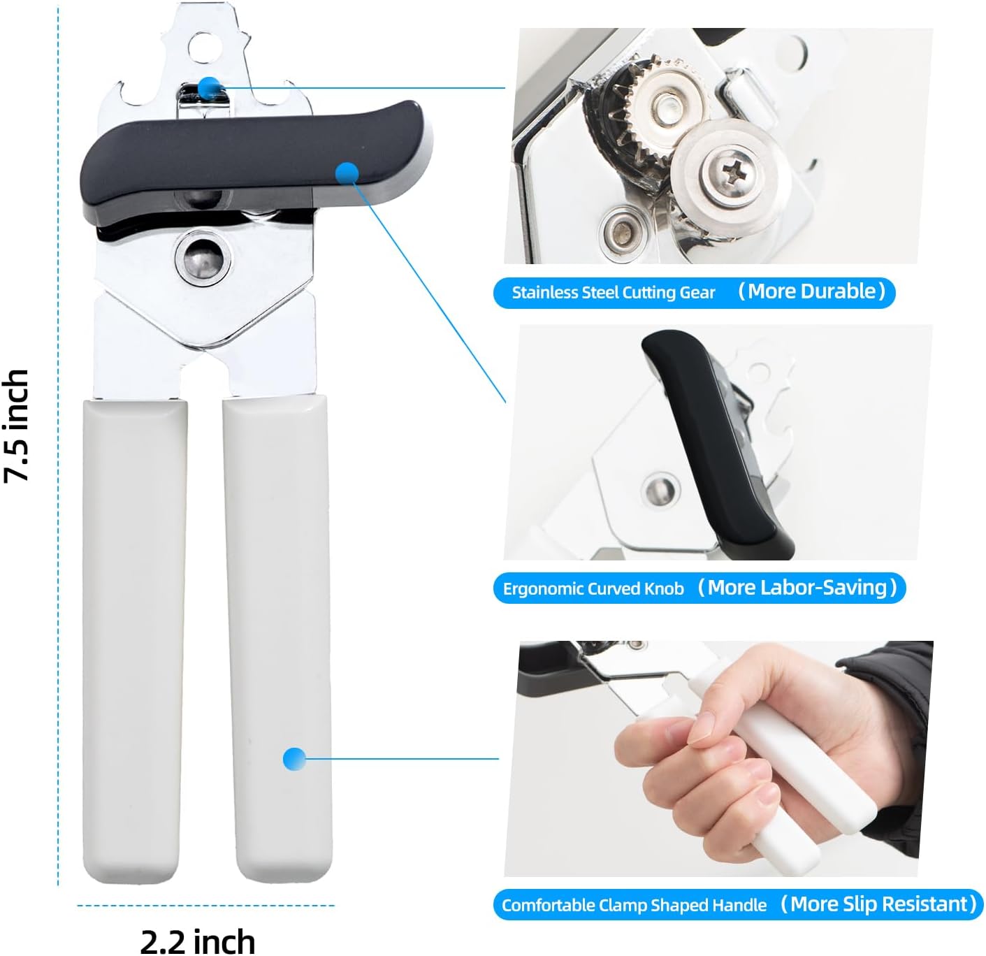 Can Opener Manual, Can Openers Hand Held with Comfort Anti-Slip Handles, Heavy Duty Stainless Steel Can Opener Smooth Edge and Bottle Openers, Easy Turn Can Openers for Seniors, Kitchen, White