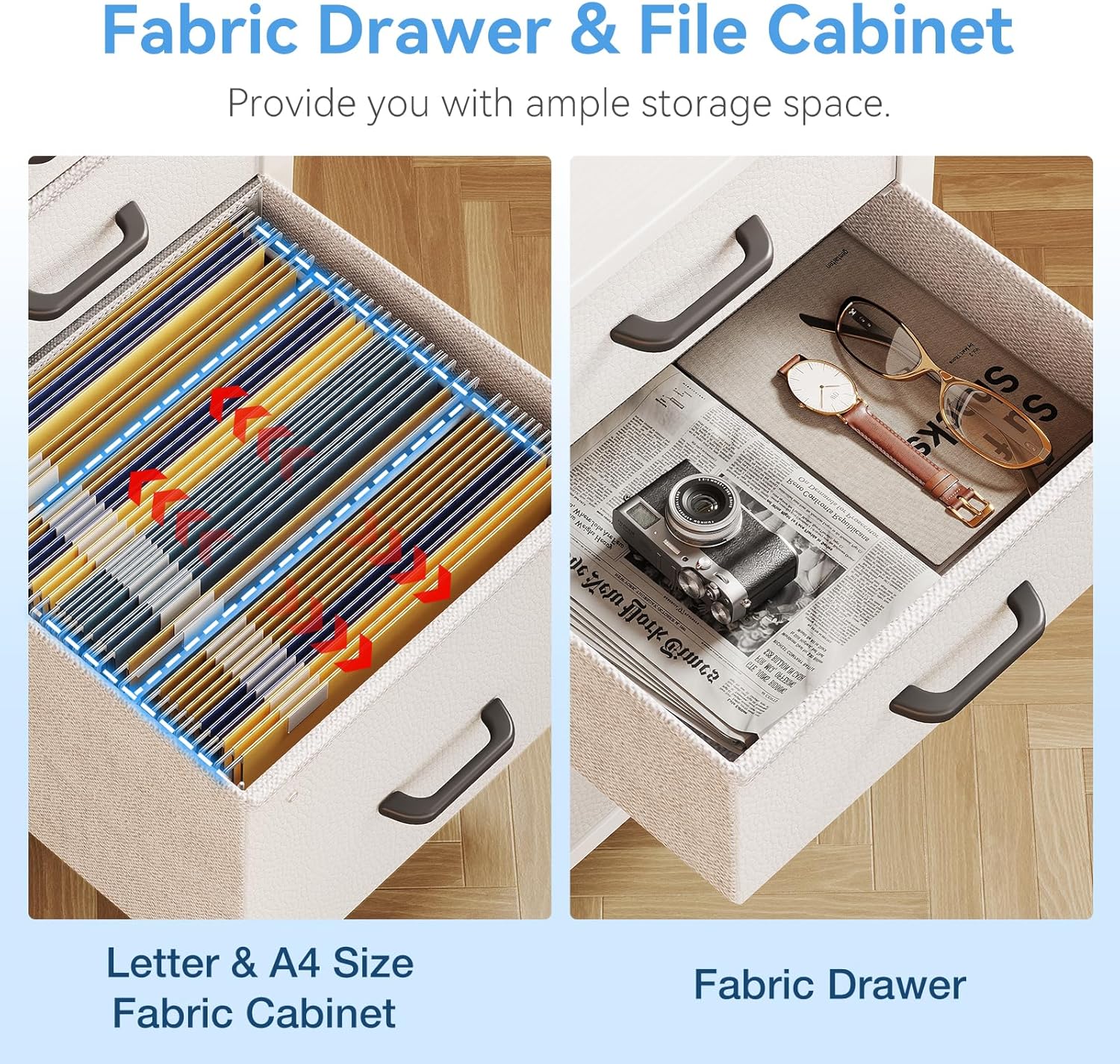 Fabric File Cabinet and Fabric Drawers: This practical desk comes with 1 fabric file cabinet and 2 fabric drawers, providing versatile storage for letter, A4, or legal-sized files. The drawers are designed for easy cleaning, helping you keep office or study supplies organized and dust-free, while the spacious desktop ensures a clutter-free and productive workspace.