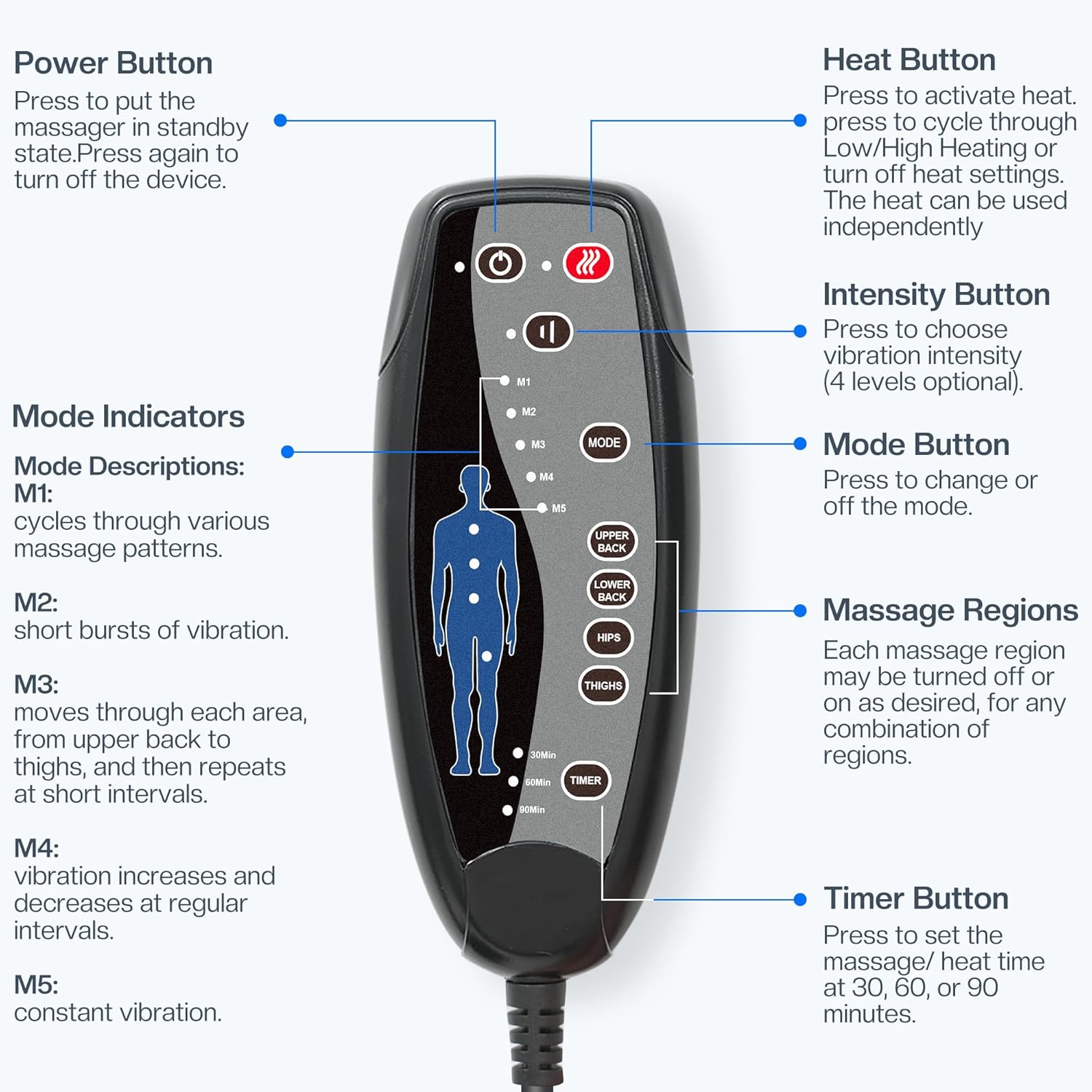 [Intelligent and Safe Heating Function] CILI back massager with heat is equipped with 3 heat elements. With 2 adjustable heating levels, CILI chair massager provides a comforting warm massage experience. The heating function can be used independently, and the back massager includes overheat protection as well as a convenient automatic shutdown function with 30, 60, and 90-minute options. The massage pad provides greater time selectivity compared to other products.