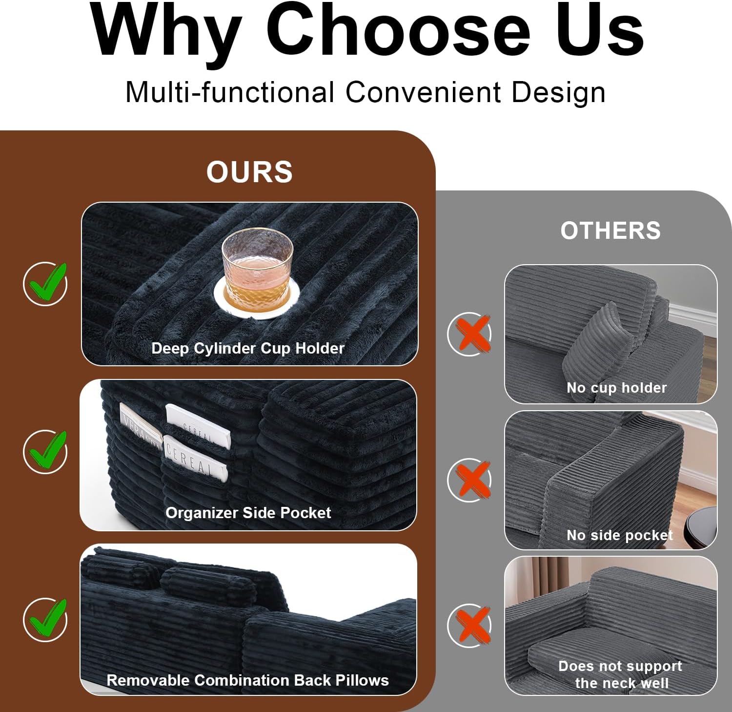 【Lazy Living Ready Design】Keep Essentials at Arm’s Reach. Dual cup holders (secures 32 oz tumblers); Hidden corduroy pockets (fits 12.9″ iPad + remotes); 6 detachable cushions (3 lumbar + 3 bolster pillows) for full chaise support. No more couch acrobatics – everything stays organized!