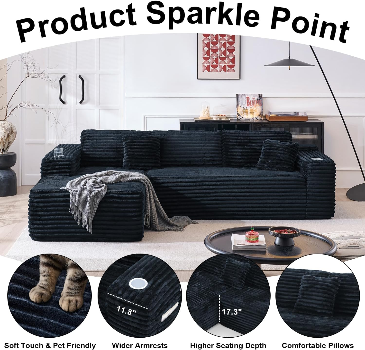 Cloud Sectional Couch with L-Shape Chaise, Modern Modular Sofa with Deep Seat, Built-in Cup Holder & Storage Pocket for Living Room Bedroom, No Assembly Required (Black, Right Facing Chaise)